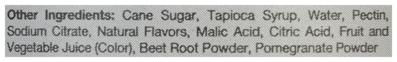 Ingredients: Other Ingredients: Cane Sugar, Tapioca Syrup, Water, Pectin, Sodium Citrate, Natural Flavors, Malic Acid, Citric Acid, Fruit and Vegetable Juice (Color), Beet Root Powder, Pomegranate Powder