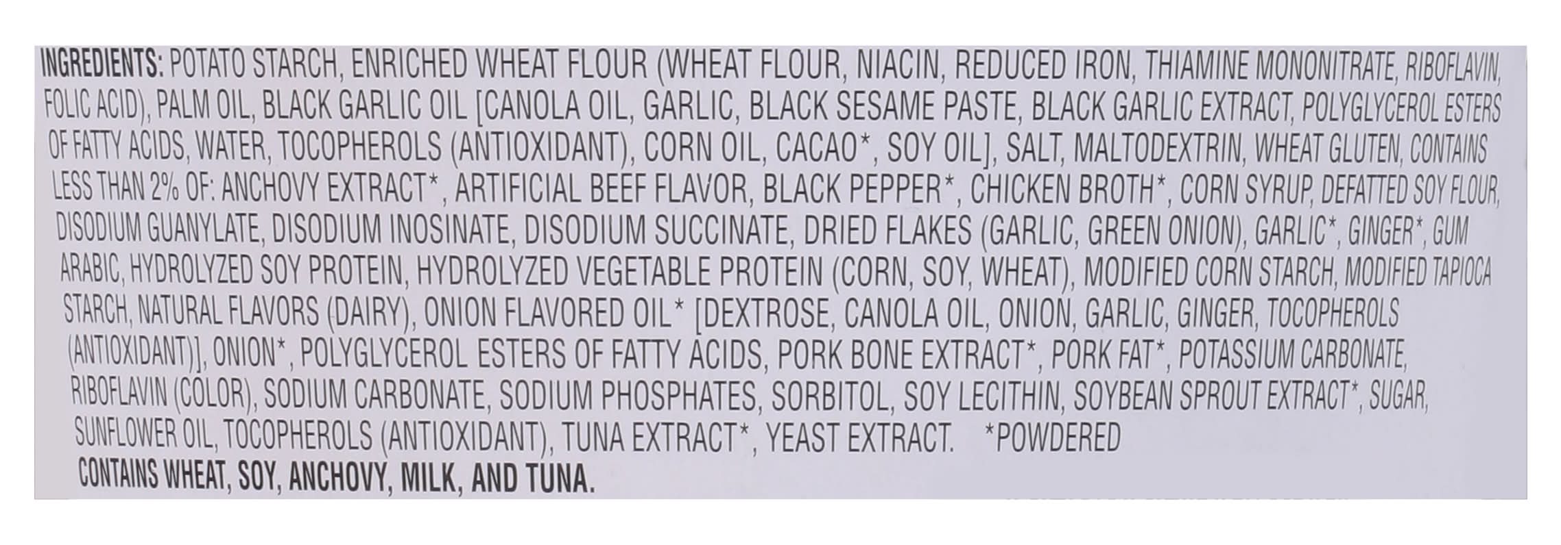 Ingredients: Potato Starch, Enriched Wheat Flour (Wheat Flour, Niacin, Reduced Iron, Thiamine Mononitrate, Riboflavin, Folic Acid), Palm Oil, Black Garlic Oil [Canola Oil, Garlic, Black Sesame Paste, Black Garlic Extract, Polyglycerol Esters of Fatty Acids, Water, Tocopherols (Antioxidant), Corn Oil, Cacao (Powdered), Soy Oil], Salt, Maltodextrin, Wheat Gluten, Contains Less than 2% of: Anchovy Extract (Powdered), Artificial Beef Flavor, Black Pepper (Powdered), Chicken Broth (Powdered), Corn Syrup, Defatted Soy Flour, Disodium Guanylate, Disodium Inosinate, Disodium Succinate, Dried Flakes (Garlic, Green Onion), Garlic (Powdered), Ginger (Powdered), Gum Arabic, Hydrolyzed Soy Protein, Hydrolyzed Vegetable Protein (Corn, Soy, Wheat), Modified Corn Starch, Modified Tapioca Starch, Natural Flavors (Dairy), Onion Flavored Oil (Powdered) [Dextrose, Canola Oil, Onion, Garlic, Ginger, Tocopherols (Antioxidant)], Onion (Powdered), Polyglycerol Esters of Fatty Acids, Pork Bone Extract (Powdered), Pork Fat (Powdered), Potassium Carbonate, Riboflavin (Color), Sodium Carbonate, Sodium Phosphates, Sorbitol, Soy Lecithin, Soybean Sprout Extract (Powdered), Sugar, Sunflower Oil, Tocopherols (Antioxidant), Tuna Extract (Powdered), Yeast Extract Contains: Wheat, Sesame, Soybeans, Fish, Anchovy, Milk, Fish, Tuna, Corn, Gluten, Eggs, Crustacean Shellfish, Tree Nuts, Peanuts