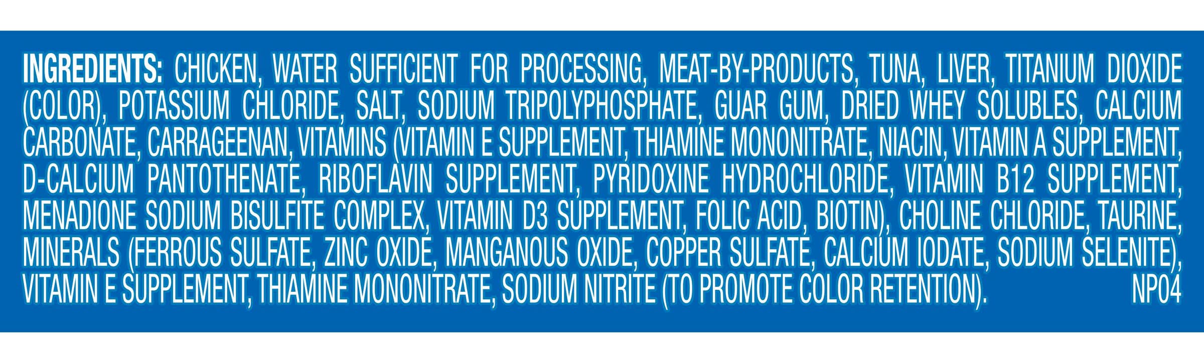 Ingredients: Chicken, Water Sufficient For Processing, Meat-by-products, Tuna, Liver, Titanium Dioxide (color), Potassium Chloride, Salt, Sodium Tripolyphosphate, Guar Gum, Dried Whey Solubles, Calcium Carbonate, Carrageenan, Vitamins (vitamin E Supplement, Thiamine Mononitrate, Niacin, Vitamin A Supplement, D-calcium Pantothenate, Riboflavin Supplement, Pyridoxine Hydrochloride, Vitamin B12 Supplement, Menadione Sodium Bisulfite Complex, Vitamin D3 Supplement, Folic Acid, Biotin), Choline Chloride, Taurine, Minerals (ferrous Sulfate, Zinc Oxide, Manganous Oxide, Copper Sulfate, Calcium Iodate, Sodium Selenite), Vitamin E Supplement, Thiamine Mononitrate, Sodium Nitrite (to Promote Color Retention)
