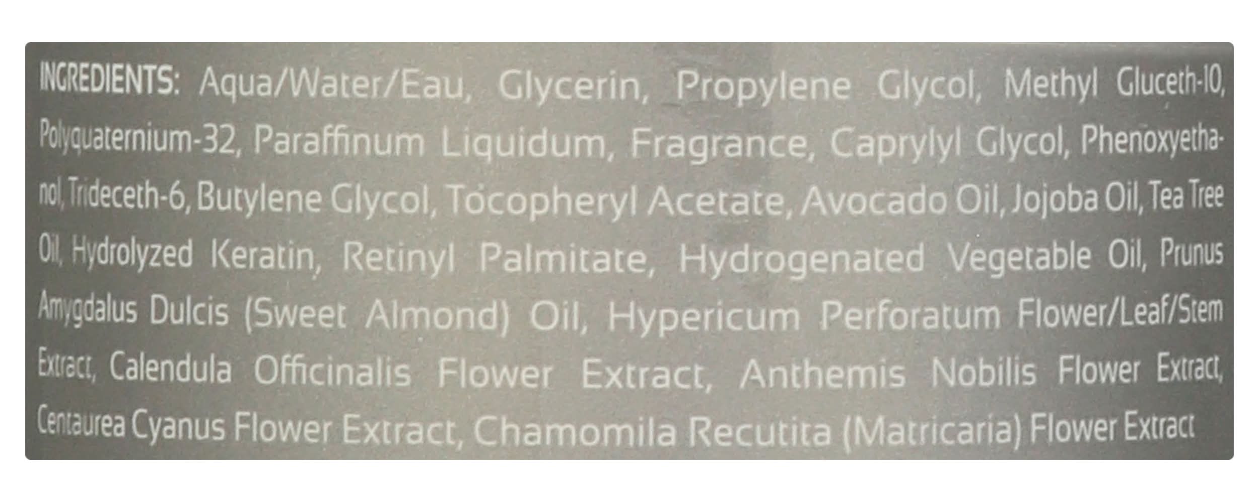 Ingredients: Aqua/Water/Eau, Glycerin, Propylene Glycol, Methyl Gluceth-10, Polyquaternium-32, Paraffinum Liquidum, Fragrance, Caprylyl Glycol, Phenoxyethanol, Tricedeth-6, Butylene Glycol, Tocopheryl Acetate, Avocado Oil, Jojoba Oil, Tea Tree Oil, Hydrolyzed Keratin, Retinyl Palmitate, Hydrogenated Vegetable Oil, Prunus Amygdalus Dulcis (Sweet Almond), Oil, Hypericum Perforatum Flower/Leaf/Stem Extract, Calendula Officinalis Flower Extract, Anthemis Nobilis Flower Extract, Centaurea Cyanus Flower Extract, Chamomila Recutita (Matricaria) Flower Extract Contains: Tree Nuts