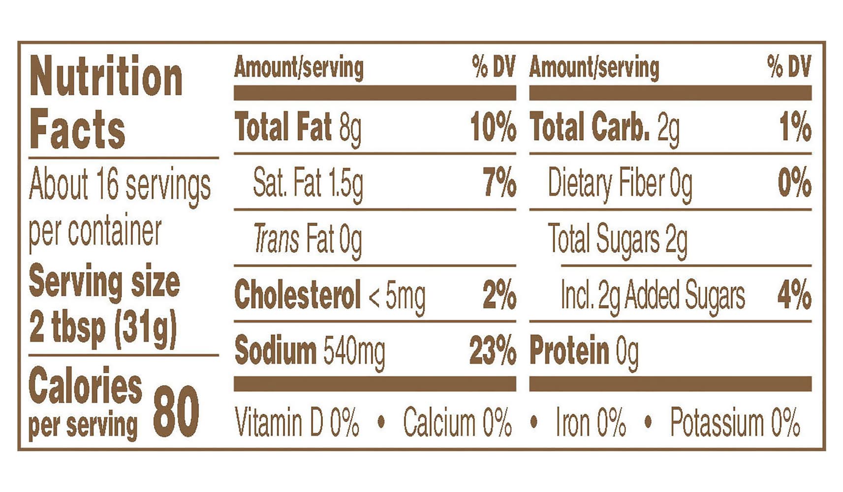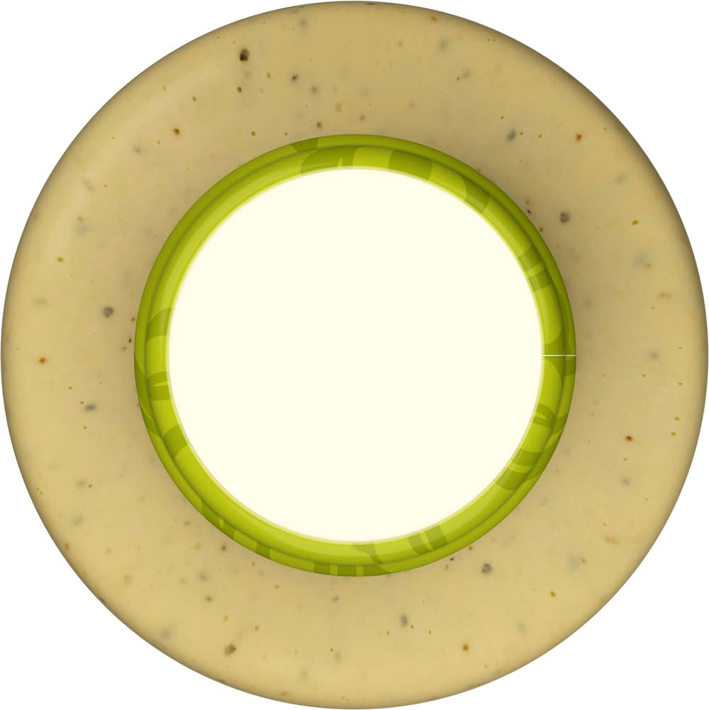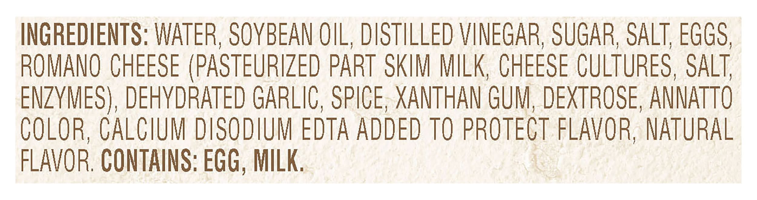 Ingredients: Water, Soybean Oil, Distilled Vinegar, Sugar, Salt, Eggs, Romano Cheese (Pasteurized Part Skim Milk, Cheese Cultures, Salt, Enzymes), Dehydrated Garlic, Spice, Xanthan Gum, Dextrose, Annatto Color, Calcium Disodium EDTA Added to Protect Flavor, Natural Flavor Contains: Eggs, Milk, Soybeans