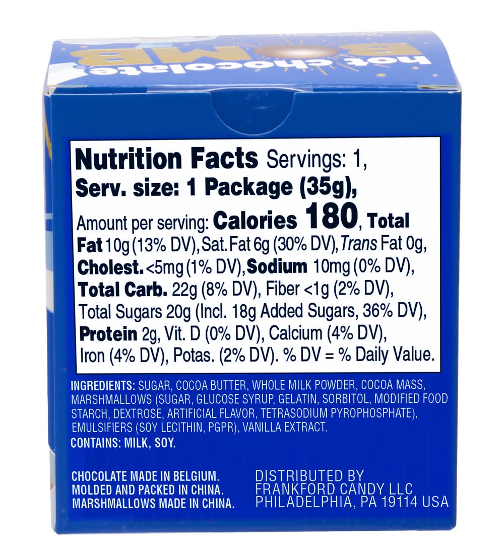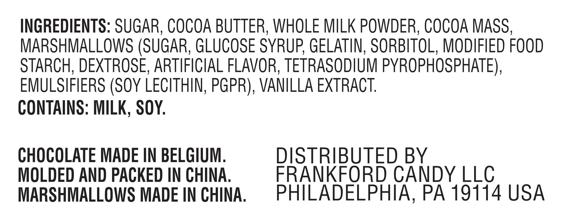 Ingredients: Sugar, Cocoa Butter, Whole Milk Powder, Cocoa Mass, Marshmallows (Sugar, Glucose Syrup, Gelatin, Sorbitol, Modified Food Starch, Dextrose, Artificial Flavor, Tetrasodium Pyrophosphate), Emulsifiers (Soy Lecithin, Pgpr), Vanilla Extract Contains: Soybean and its Derivatives, Milk and its derivates