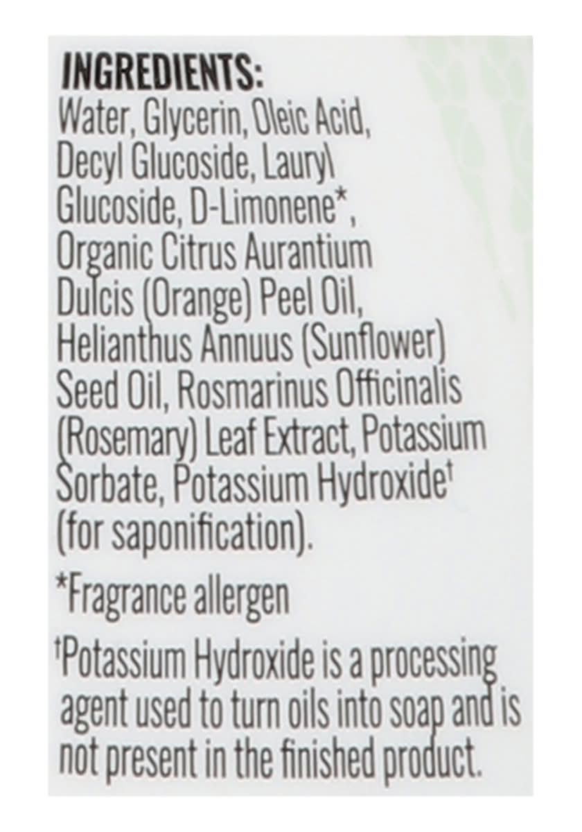 Ingredients: Water, Glycerin, Oleic Acid, Decyl Glucoside, Lauryl Glucoside, D-Limonene (Fragrance Allergen), Organic Citrus Aurantium Dulcis (Orange) Peel Oil, Helianthus Annuus (Sunflower) Seed Oil, Rosmarinus Officinalis (Rosemary) Leaf Extract, Potassium Sorbate, Potassium Hydroxide (Potassium Hydroxide is a Processing Agent Used to Turn Oils Into Soap and is Not Present in the Finished Product) (for Saponification)
