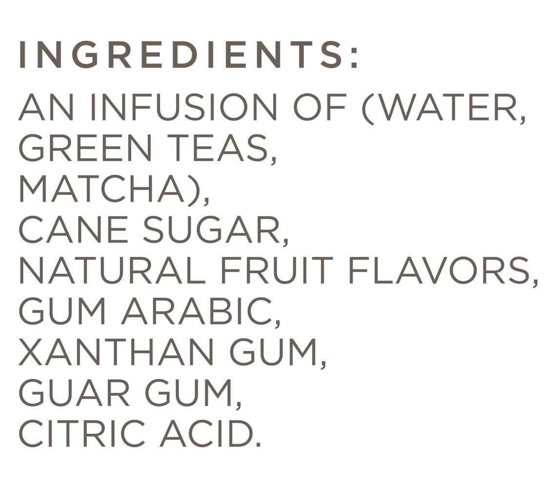 Ingredients: An Infusion of Water, Green Teas, Matcha, Cane Sugar, Natural Fruit Flavors, Gum Arabic, Xanthan Gum, Guar Gum, Citric Acid.