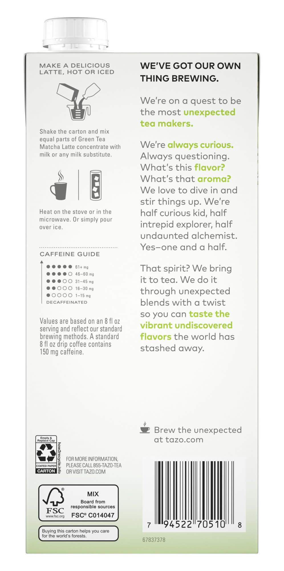 TAZO Concentrate Green Tea Matcha Latte, 32 oz • Flavor: Matcha latte • Size: 32 OZ • Number of servings: 5 • Unilever, Englewood Cliffs, NJ, 07632, Ph: 855-TAZO-TEA • Packaging: Reusable