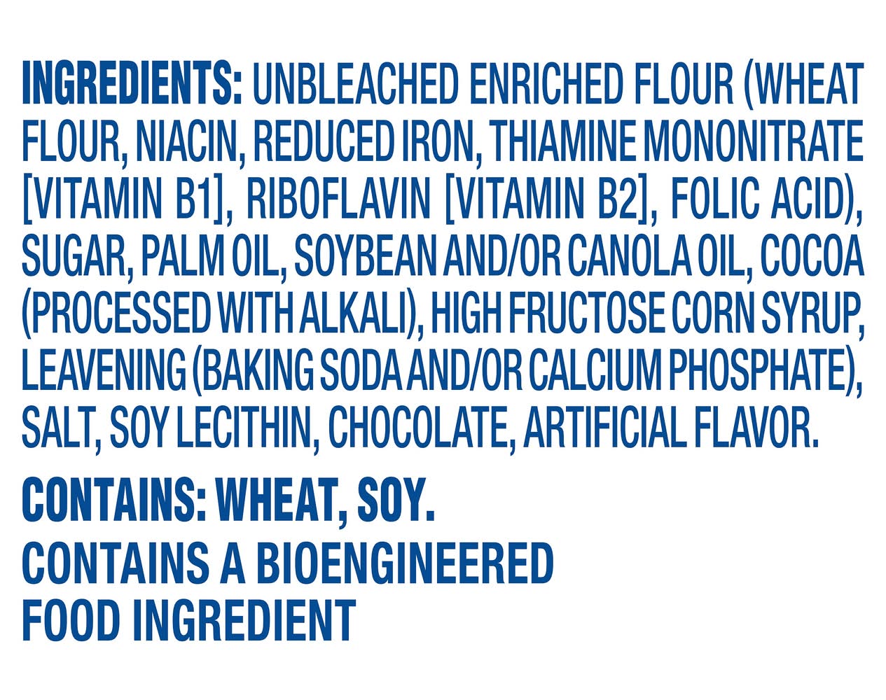 Ingredients: Unbleached Enriched Flour (Wheat Flour, Niacin, Reduced Iron, Thiamine Mononitrate [Vitamin B1], Riboflavin [Vitamin B2], Folic Acid), Sugar, Palm Oil, Soybean and/or Canola Oil, Cocoa (Processed with Alkali), High Fructose Corn Syrup, Leavening (Baking Soda and/or Calcium Phosphate), Salt, Soy Lecithin, Chocolate, Artificial Flavor Contains: Wheat, Soybeans, Corn
