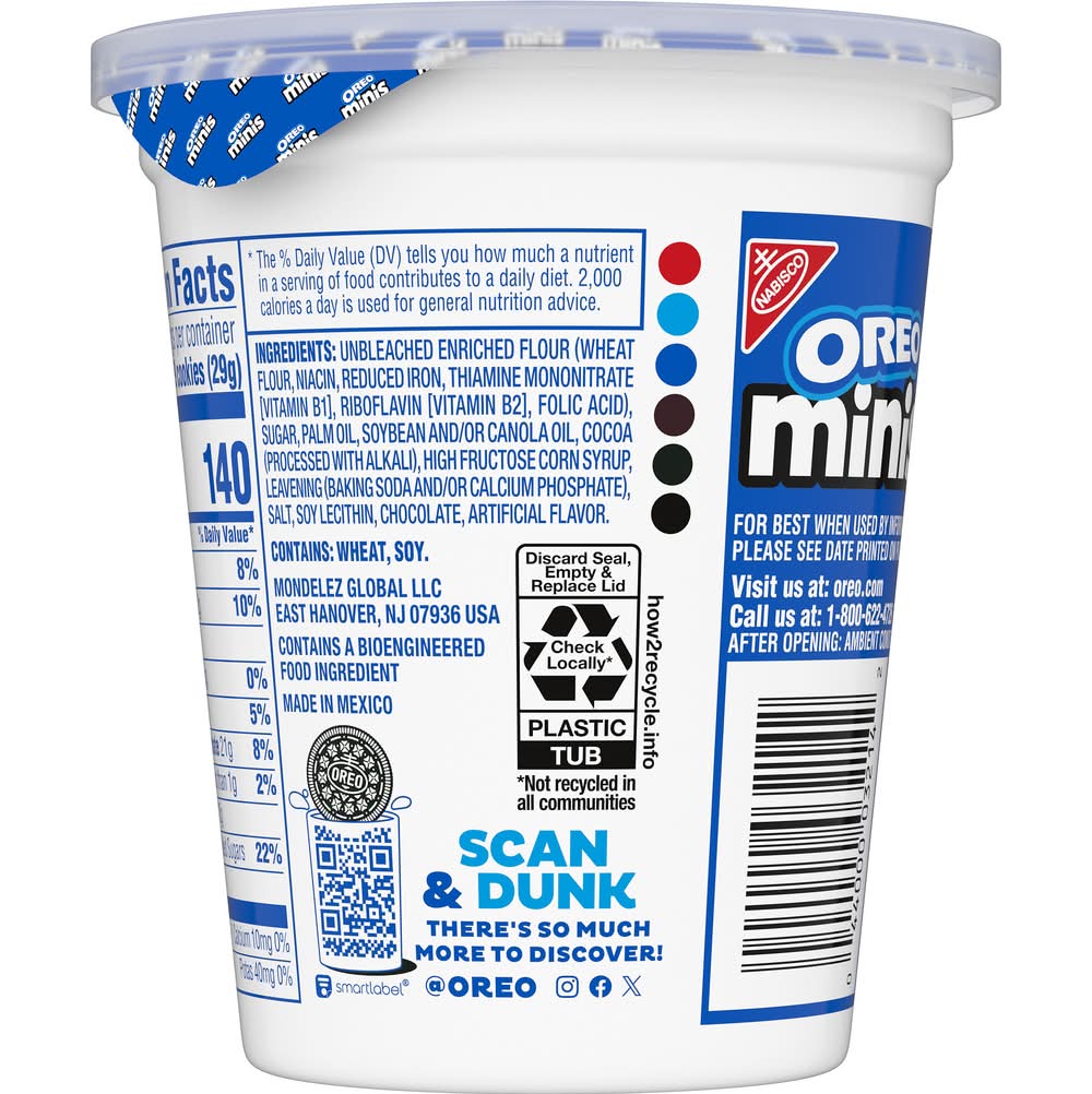 Take A Delicious Break With Oreo Minis Chocolate Sandwich Cookies. A Tiny Twist On Classic Oreo Chocolate Cookies, These Mini Cookies Sandwich Scrumptious Oreo Creme Filling Between Two Oreo Chocolate Wafers That Are Always Made With Real Cocoa, But In Bite Size Cookies That Are Easy To Enjoy. Oreo Minis Are Packaged In Convenient Snack Cookie Cups That Are Sized For Snacking At Home Or On The Go, Making Them Great For Sharing With Family And Friends Or Topping Your Favorite Ice Cream, Cake, Or Cupcake Recipe For An Exciting Dessert. Oreo Mini Chocolate Sandwich Cookies Are Delicious With Or Without Milk, And These Snack Cookies Make Great Party Favors, Stocking Stuffers, Easter Basket Fillers, And Halloween Treats. These Individual Cookie Cup Snack Packs Are Tasty Lunchbox Snacks, Travel Snacks, And On The Go Snacks For Kids And Adults. • Size: 3.5 OZ • Mondelez Global LLC, East Hanover, NJ, 07936, USA • Packaging: Reusable