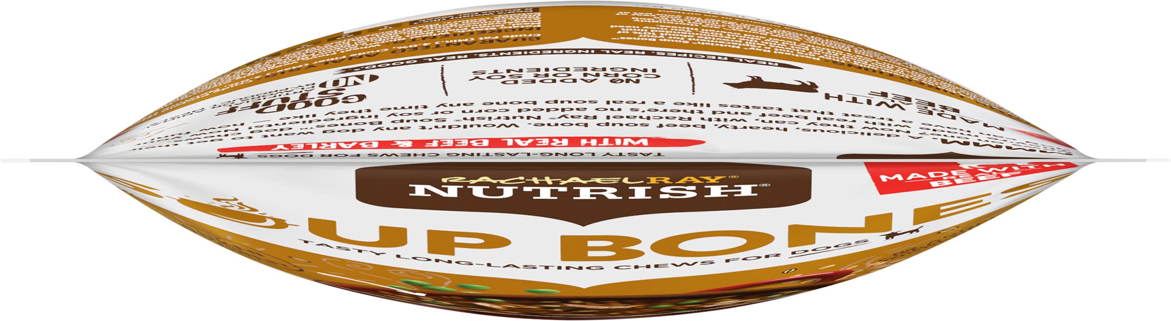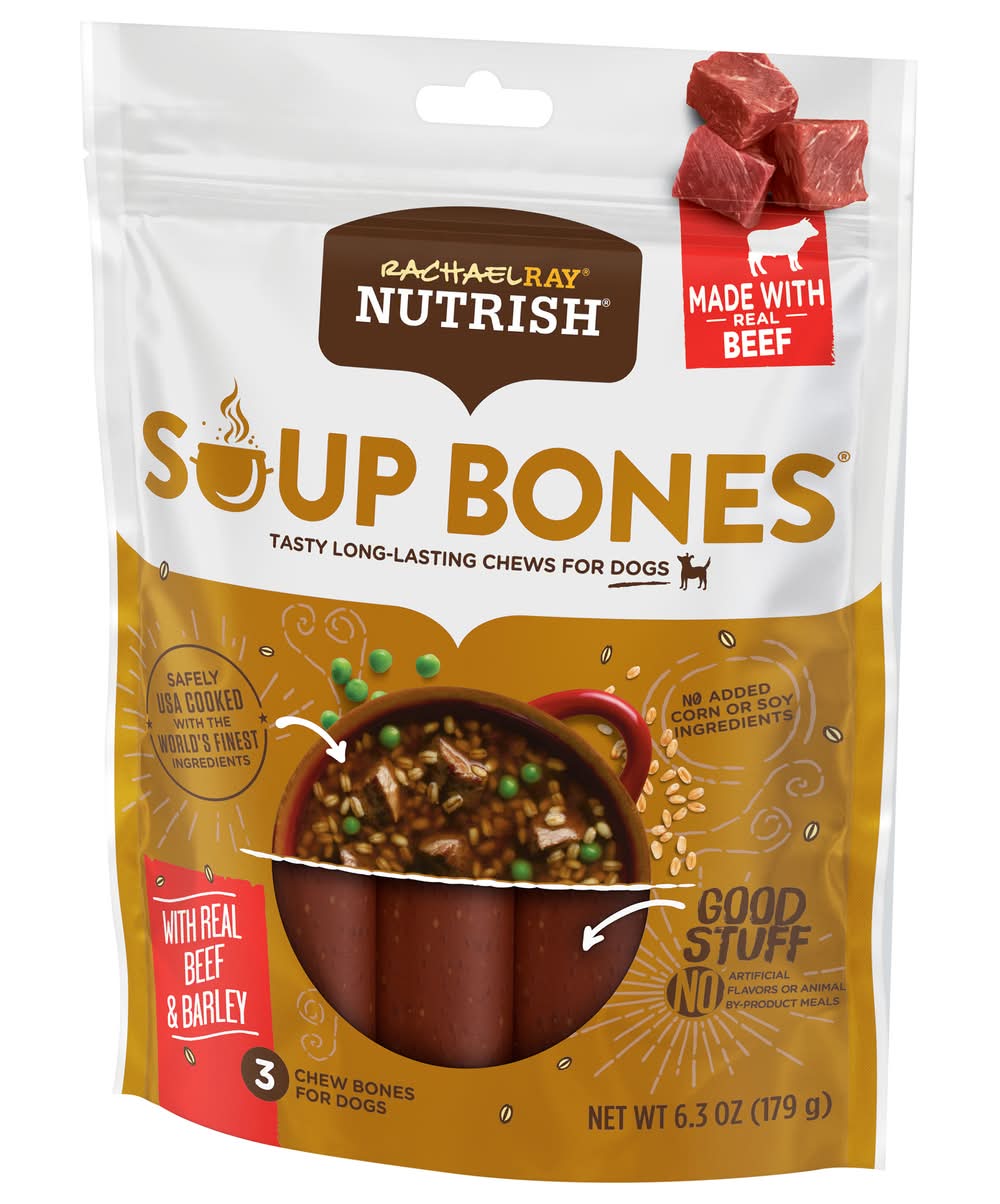 Feeding directions: rachael ray nutrish soup bones are intended for intermittent or supplemental feeding only. they are not a replacement for your dog's main meal. the recommended limit of chews will provide about 10% of your dog's weekly calories. if you indulge your pet with the recommended limit of chews, then please reduce the amount of food by about 10%. you may need to feed less, depending on your dog's activity level and overall fitness. please watch your dog to ensure the nutrish soup bone is thoroughly chewed before swallowing. to avoid harm to your dog, do not let your dog gulp large pieces. for safety reasons nutrish soup bones may not be suitable for you breeds, and are not recommended for dogs under one year of age or smaller than 10 lbs. provide a bowl of fresh, clean water for your pet at all times. close package tightly between feedings or store product in an airtight container to maintain freshness. dog's weight: 10 lbs; 1 bones per week. 20 lbs; 2 bones per week. 30 lbs; 3 bones per week. 40 lbs; 4 bones per week. 60 lbs; 5 bones per week. 80 lbs; 6 bones per week. 100+ lbs; 7 bones per week.