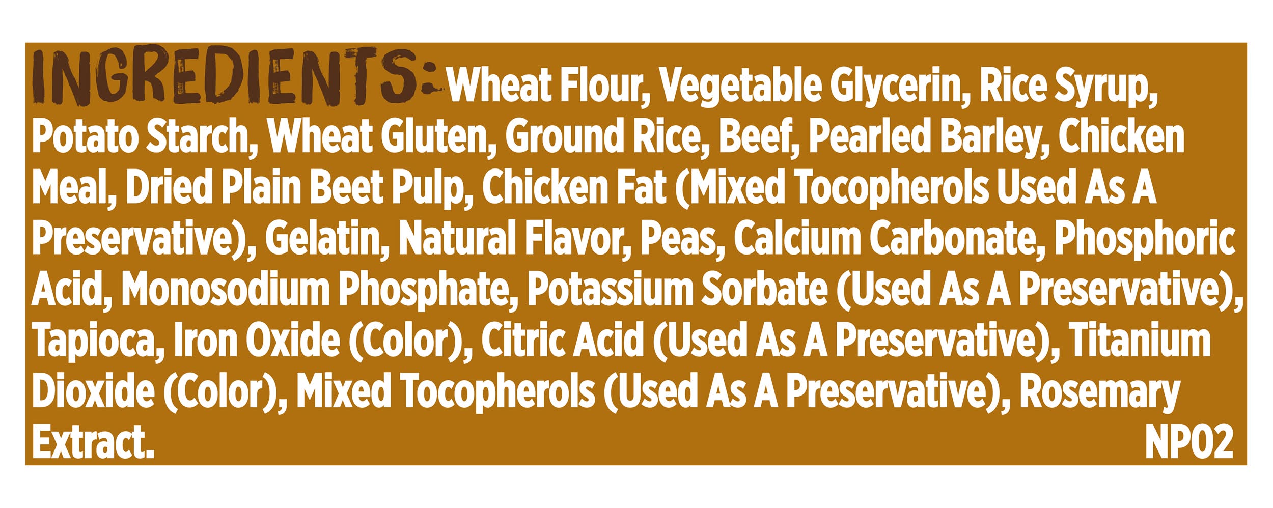 Ingredients: Wheat Flour, Vegetable Glycerin, Rice Syrup, Potato Starch, Wheat Gluten, Ground Rice, Beef, Pearled Barley, Chicken Meal, Dried Plain Beet Pulp, Chicken Fat (Mixed Tocopherols Used as a Preservative), Gelatin, Natural Flavor, Peas, Calcium Carbonate, Phosphoric Acid, Monosodium Phosphate, Potassium Sorbate (Used as a Preservative), Tapioca, Iron Oxide (Color), Citric Acid (Used as a Preservative), Titanium Dioxide (Color), Mixed Tocopherols (Used as a Preservative), Rosemary Extract. NP02 Contains: Wheat, Gluten, Barley