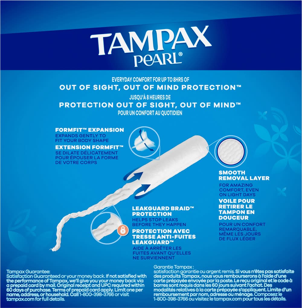 2x as absorbent (vs regular absorbency tampons). LeakGuard protection. For your heaviest days. Everyday comfort for up to 8 hrs of out of sight, out of mind protection. FormFit Expansion: Expands gently to fit your body shape. Smooth Remove Layer: For amazing comfort, even on light days. Leakguard Braid Protection: Helps stop leaks before they happen. Easy opening. Free of perfume. Free of elemental chlorine bleaching. Core free of dyes (Braid has skin friendly pigments). Clinically tested gentle to skin. Made with care since 1936. Our best Pearl protection ever. Directions for use enclosed. Absorbency: Light. Absorbency Range (grams): Less than 6 g. Absorbency: Regular. Absorbency Range (grams): 6-9 g. Absorbency: Super. Absorbency Range (grams): 9-12 g. Absorbency: Super Plus. Absorbency Range (grams): 12-15 g. Absorbency Range: Ultra. Absorbency Range (grams): 15-18 g. • Size: 18 CT • Procter & gamble, Cincinnati, OH, 45202, 800-523-0014
