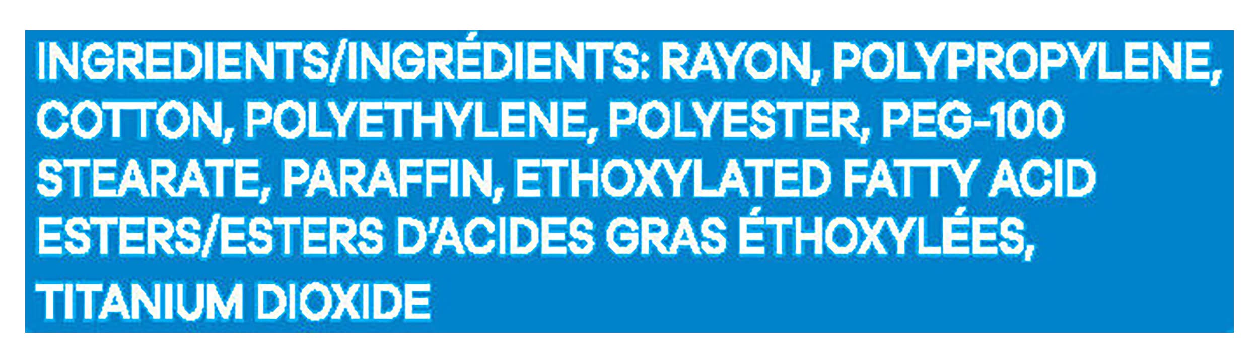 Ingredients: Rayon, Polypropylene, Cotton, Polyethylene, Polyester, PEG-100 Stearate, Paraffin, Ethoxylated Fatty Acid Esters, Titanium Dioxide