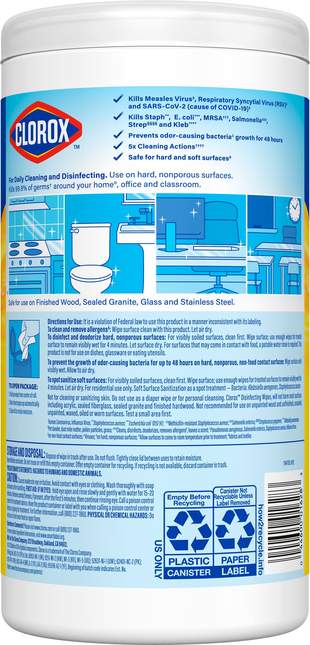 Directions for use: Directions for Use: It is a violation of Federal law to use this product in a manner inconsistent with its labeling. To clean and remove allergens (Pet dander, dust mite matter, pollen particles, grass): Wipe surface clean with this product. Let air dry. To disinfect and deodorize hard, nonporous surfaces: Wipe surface; use enough wipes for treated surface to remain visibly wet after for 4 minutes. Let surface dry. For highly soiled surfaces, clean excess dirt first. For surfaces that may come in contact with food, a potable water rinse is required. This product is not for use on dishes, glassware or eating utensils. Not for cleaning or sanitizing skin. Do not use as a diaper wipe or for personal cleansing. Clorox Disinfecting Wipes, will not harm most surfaces including acrylic, sealed fiberglass, sealed granite and finished hardwood. Not recommended for use on unpainted wood and unfinished, unsealed, unpainted, waxed, oiled or worn surfaces. Testa small area first. Do not flush. Storage and Disposal: Dispose of wipe in trash after use. Do not flush. Tightly closed lid between uses to retain moisture. Nonrefillable container. Do not reuse or refill this empty container. Offer empty container for recycling, if recycling is not available, discard container in trash. To Open Package: 1. Pull out wipe from center of roll. 2. Next sheet pops up automatically. 3. Close lid to retain moisture. Storage recommendation: Storage and Disposal: Dispose of wipe in trash after use. Do not flush. Tightly closed lid between uses to retain moisture. Nonrefillable container. Do not reuse or refill this empty container. Offer empty container for recycling, if recycling is not available, discard container in trash.