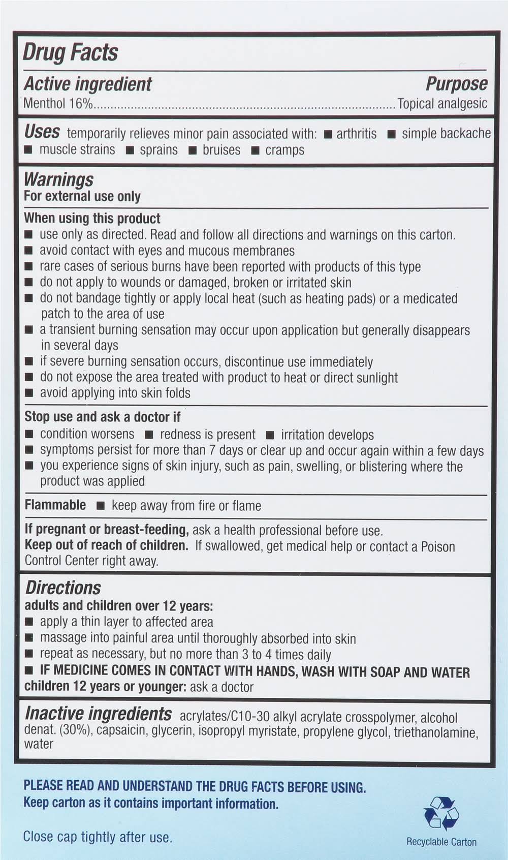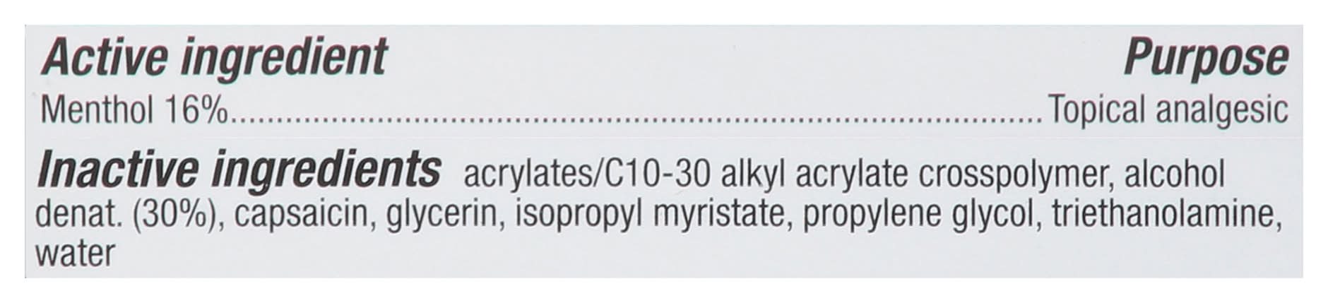 Ingredients: Active Ingredients: Menthol (16 %), Topical Analgesic. Inactive Ingredients: Acrylates/C10-30 Alkyl Acrylate Crosspolymer, Alcohol Denat. (30%), Capsaicin, Glycerin, Isopropyl Myristate, Propylene Glycol, Triethanolamine, Water