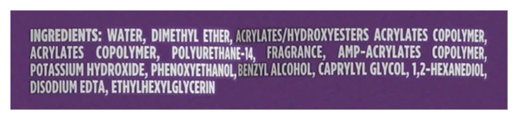 Ingredients: Water, Dimethyl Ether, Acrylates/Hydroxyesters Acrylates Copolymer, Acrylates Copolymer, Polyurethane-14, Fragrance, AMP-Acrylates Copolymer, Potassium Hydroxide, Phenoxyethanol, Benzyl Alcohol, Caprylyl Glycol, 1, 2-Hexanediol, Disodium EDTA, Ethylhexylglycerin