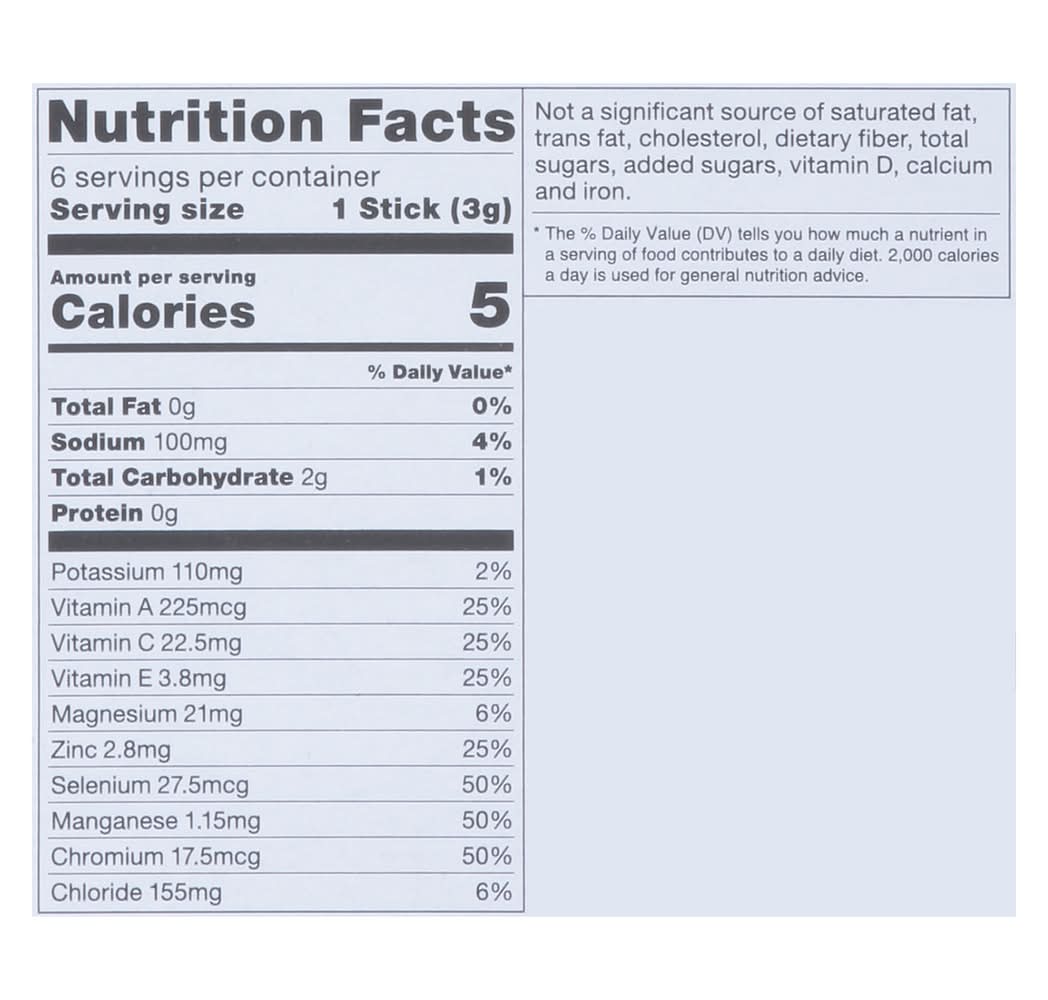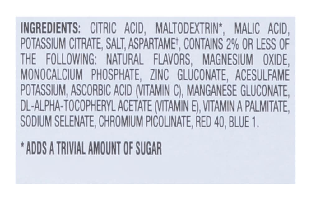 Ingredients: Citric Acid, Maltodextrin (Adds a Trivial Amount of Sugar), Malic Acid, Potassium Citrate, Salt, Aspartame (Adds a Trivial Amount of Sugar), Contains 2% or Less of the Following: Natural Flavors, Magnesium Oxide, Monocalcium Phosphate, Zinc Gluconate Acesulfame, Potassium Ascorbic Acid (Vitamin C), Manganese Gluconate, DL- Alpha- Tocopheryl Acetate (Vitamin E), Vitamin A Palmitate, Sodium Selenate, Chromium Picolinate, Red 40, Blue 1