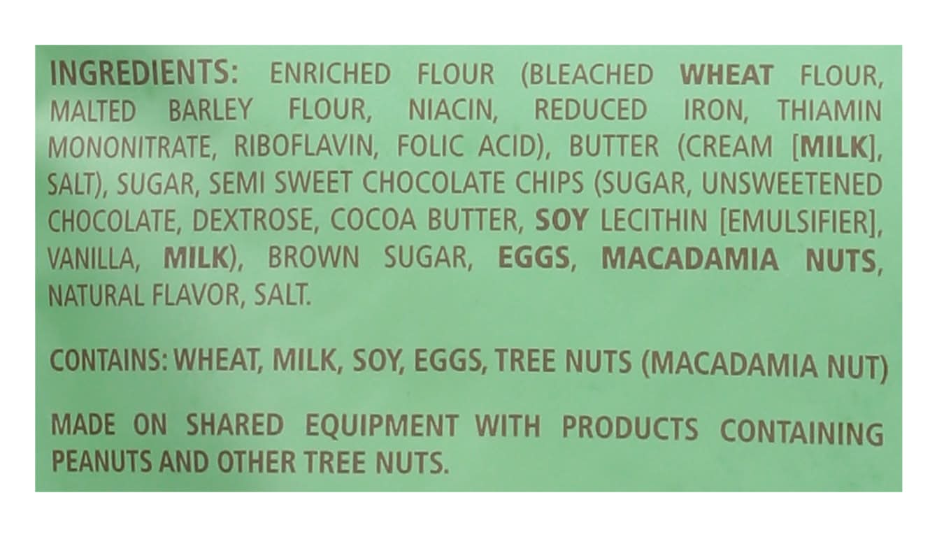 Ingredients: Enriched Flour (Bleached Wheat, Flour, Malted Barley Flour, Niacin, Reduced Iron, Thiamin Mononitrate, Riboflavin, Folic Acid), Butter (Cream [Milk], Salt), Sugar, Semi Sweet Chocolate Chips (Sugar, Unsweetened Chocolate, Dextrose, Cocoa Butter, Soy Lecithin [Emuuslfier], Vanilla, Milk), Brown Sugar, Eggs, Macadamia Nuts, Natural Flavor, Salt Contains: Wheat, Milk, Soybeans, Eggs, Tree Nuts, Tree Nuts, Macadamia Nuts, Barley, Peanuts, Tree Nuts