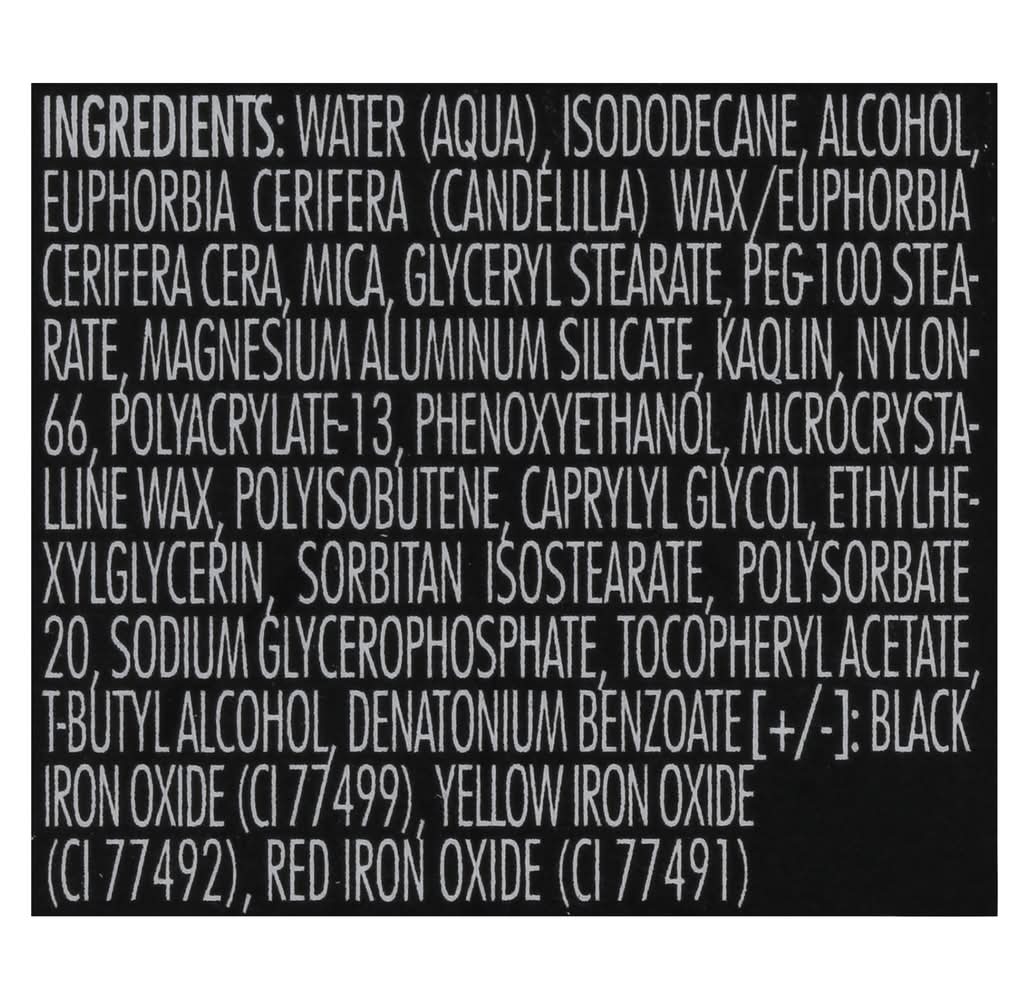 Ingredients: Water (Aqua), Isododecane, Alcohol, Euphorbia Cerifera (Candelilla) Wax/Euphorbia Cerifera Cera, Mica, Glyceryl Stearate, PEG-100 Stearate, Magnesium Aluminum Silicate, Kaqlin, Nylon-66, Polyacrylate-13, Phenoxyethanol, Microcrystalline Wax, Polyisobutene, Caprylyl Glycol, Ethylhexylglycerin, Sorbitan Isostearate, Polysorbate 20, Sodium Glycerophosphate, Tocopheryl Acetate, T-Butyl Alcohol, Denatonium Benzoate [+/-]: Black Iron Oxide (CI 77499), Yellow Iron Oxide (CI 77492), Red Iron Oxide (CI 77491)