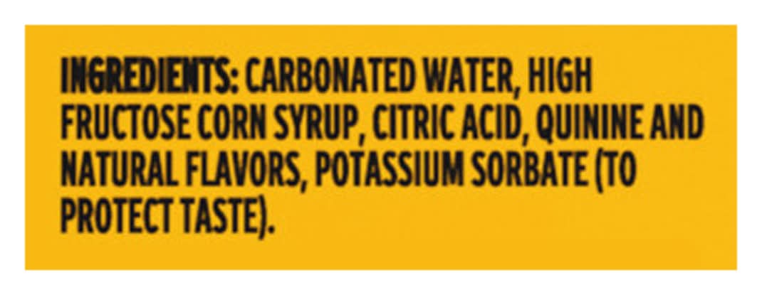 Ingredients: Carbonated Water, High Fructose Corn Syrup, Citric Acid, Quinine and Natural Flavors, Potassium Sorbate (to Protect Taste)