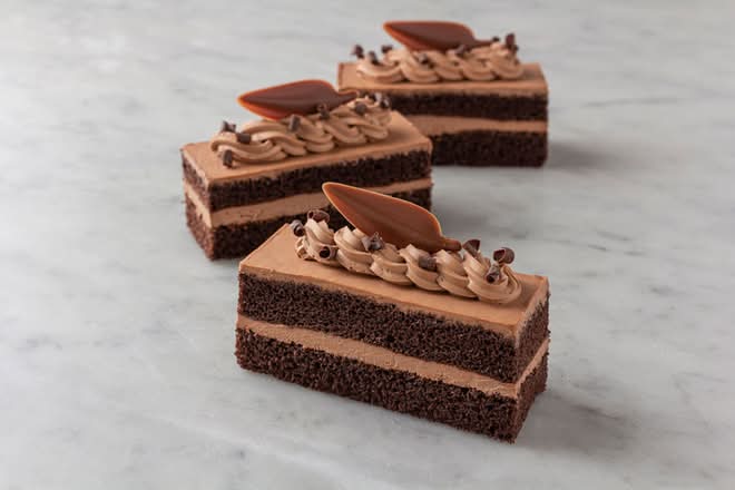 A guest favorite! A slice of moist chocolate cake layered with Porto's signature whipped chocolate ganache and topped with dark chocolate shavings.