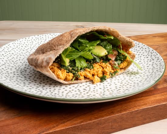 Avocados, tabbouleh, cucumbers, and sprouts, lettuce on white, wheat, spinach wrap, or pita.