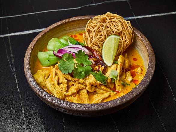 Northern Thai style creamy noodle soup from coconut milk and yellow curry base. Your choice of tender boneless chicken thigh or fried tofu, egg noodles, green apple, boy choy, red onion, scallions, and cilantro. Served with pickled cabbage ,Fried Egg Noodle