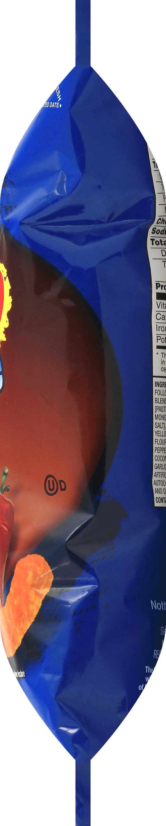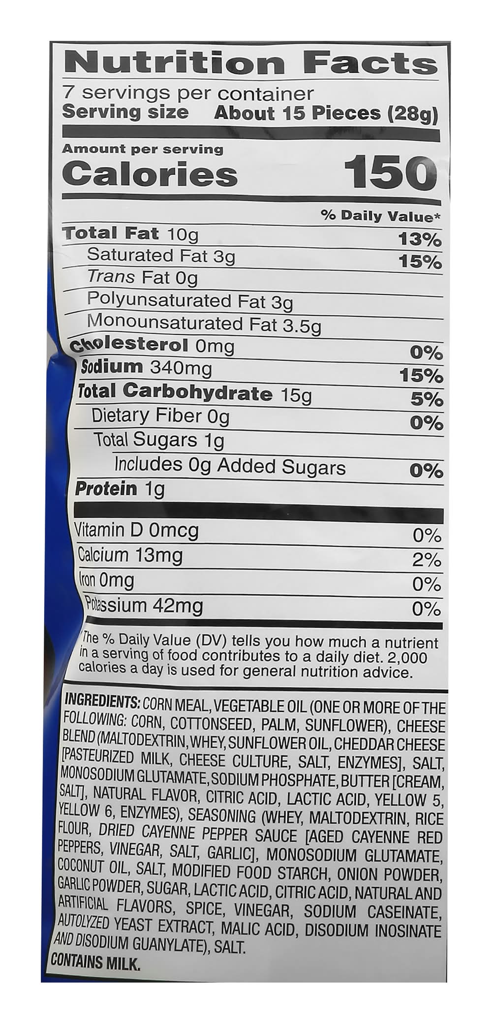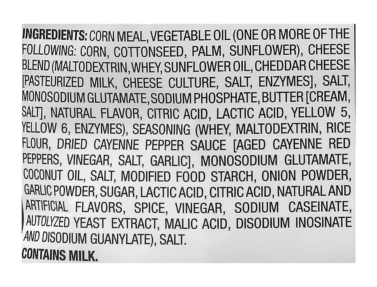 Ingredients: Corn Meal, Vegetable Oil (One or More of the Following: Corn, Cottonseed, Palm, Sunflower), Cheese Blend (Maltodextrin, Whey, Sunflower Oil, Cheddar Cheese [Pasteurized Milk, Cheese Culture, Salt, Enzymes], Salt, Monosodium Glutamate, Sodium Phosphate, Butter [Cream, Salt], Natural Flavor, Citric Acid, Lactic Acid, Yellow 5, Yellow 6, Enzymes), Seasoning (Whey, Maltodextrin, Rice Flour, Dried Cayenne Pepper Sauce [Aged Cayenne Red Peppers, Vinegar, Salt, Garlic], Monosodium Glutamate, Coconut Oil, Salt, Modified Food Starch, Onion Powder, Garlic Powder, Sugar, Lactic Acid, Citric Acid, Natural and Artificial Flavors, Spice, Vinegar, Sodium Caseinate, Autolyzed Yeast Extract, Malic Acid, Disodium Inosinate and Disodium Guanylate), Salt Contains: Milk, Tree Nuts
