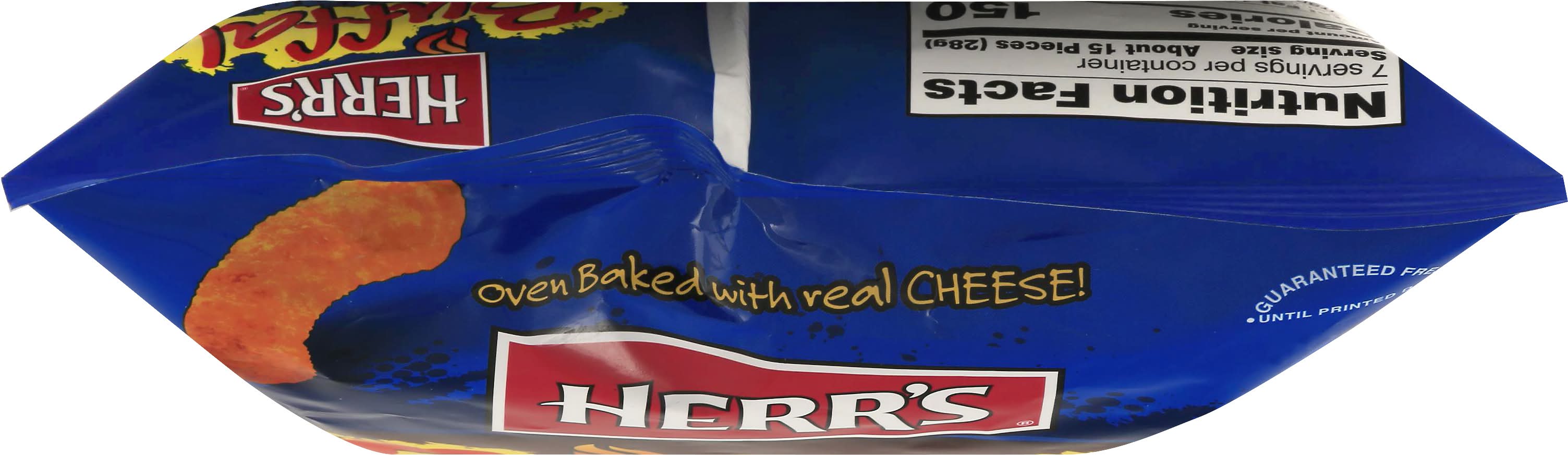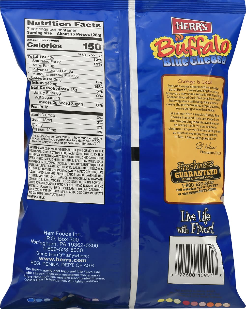 Cheese Curls, Buffalo Blue Cheese Flavored • Number of servings: 7 • HERR FOODS, Nottingham, PA, 19362-0300, Ph: 800-523-5030