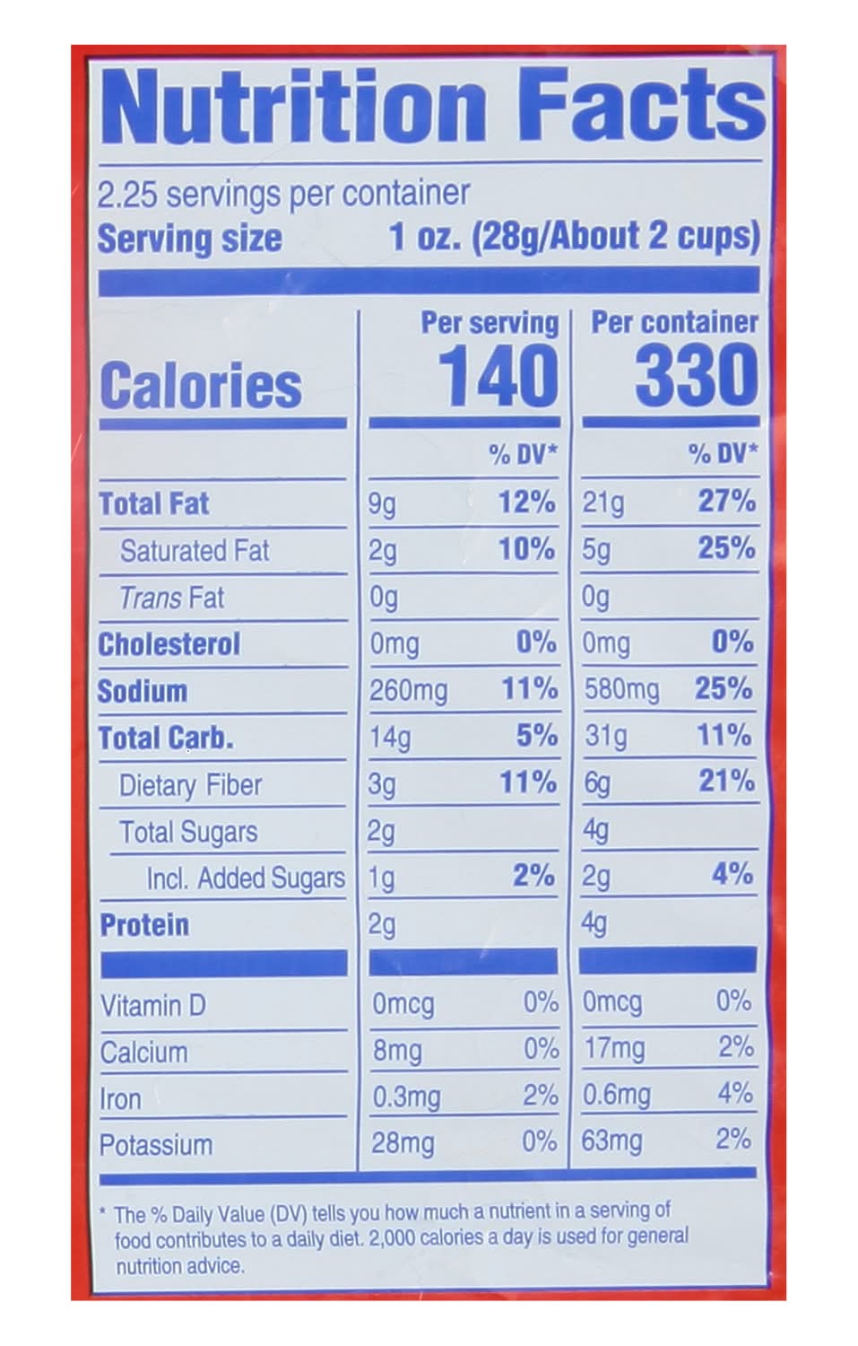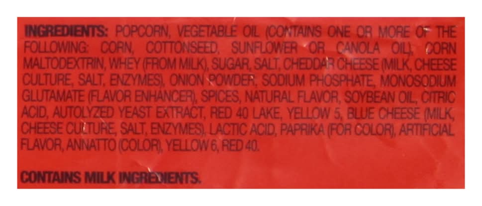 Ingredients: Popcorn, Vegetable Oil (Contains One or More of the Following Corn, Cottonseed, Sunflower or Canola Oil), Corn Maltodextrin, Whey (from Milk), Sugar, Salt, Cheddar Cheese (Milk, Cheese Culture, Salt, Enzymes), Onion Powder, Sodium Phosphate, Monosodium Glutamate (Flavor Enhancer, Spices, Natural Flavor, Soybean Oil, Citric Acid, Autolyzed Yeast Extract, Red 40 Lake, Yellow 5, Blue Cheese (Milk, Cheese Culture, Salt, Enzymes), Lactic Acid, Paprika (for Color), Artificial Flavor, Annatto (Color), Yellow 6, Red 40 Contains: Milk, Soybeans, Corn
