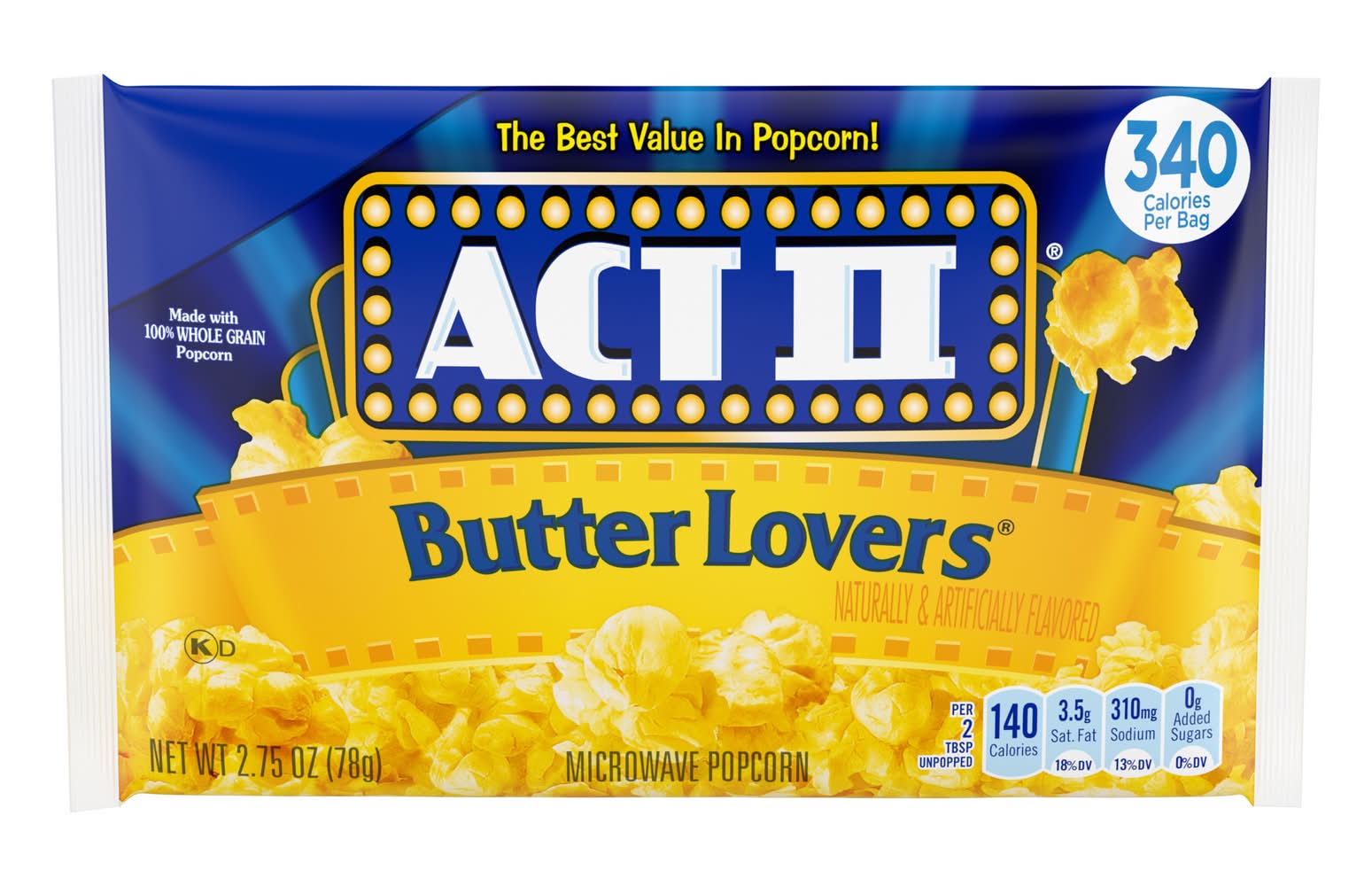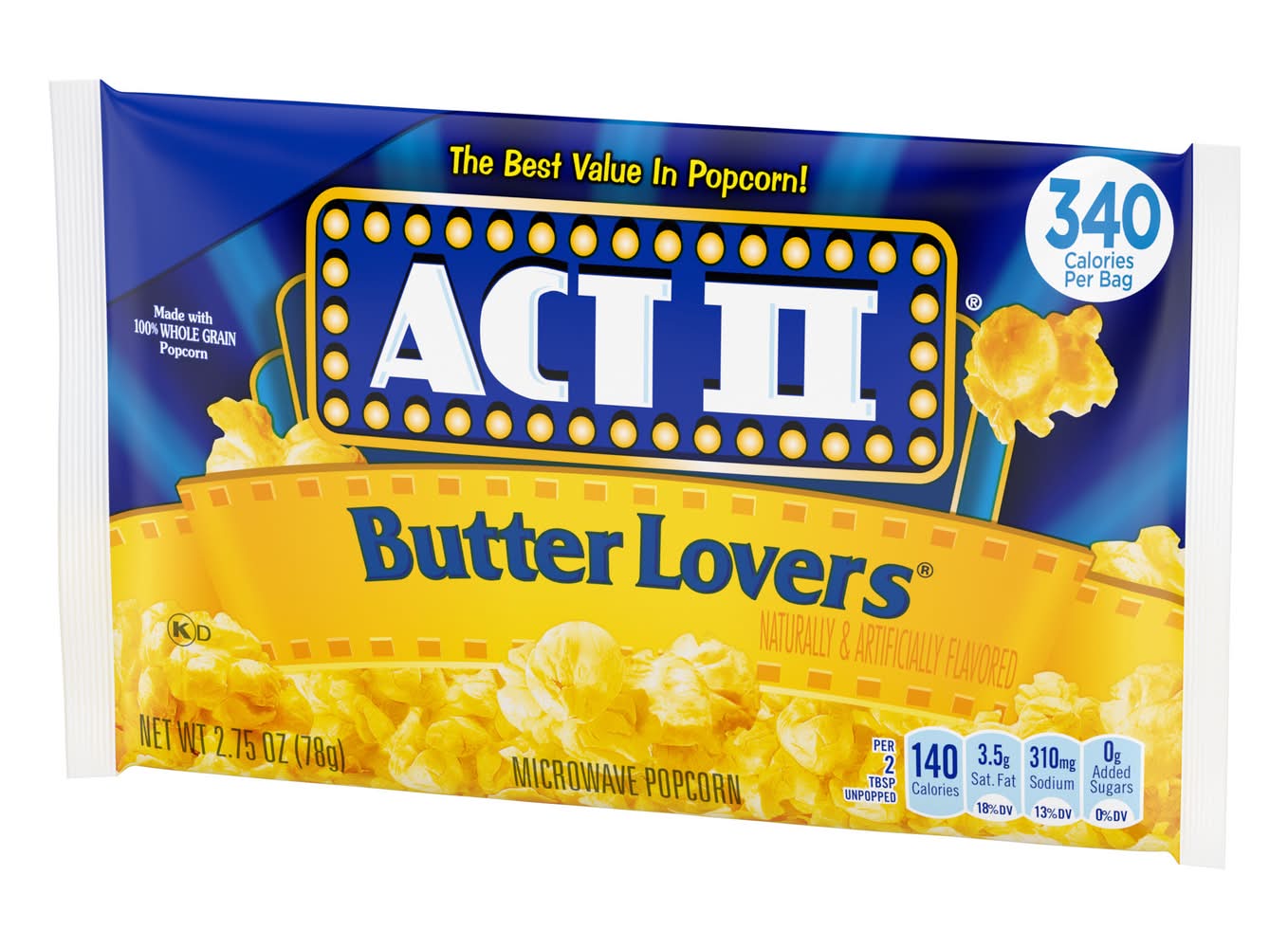 With ACT II Butter Lovers Popcorn, you'll experience love at first bite. Every fluffy kernel of this microwave popcorn is packed with rich, buttery flavor. Plus, it's made with 100% whole grain popcorn kernels and contains 0 grams of trans fat per serving. When you need a crunchy, salty snack, ACT II Butter Lovers Popcorn is ready in minutes. The microwave popcorn makes a quick and easy snack for home, school or the office. Choose ACT II Butter Lovers Popcorn for the best value in popcorn. • Flavor: Butter • Conagra Brands, PO Box 3534, Chicago, IL,60654