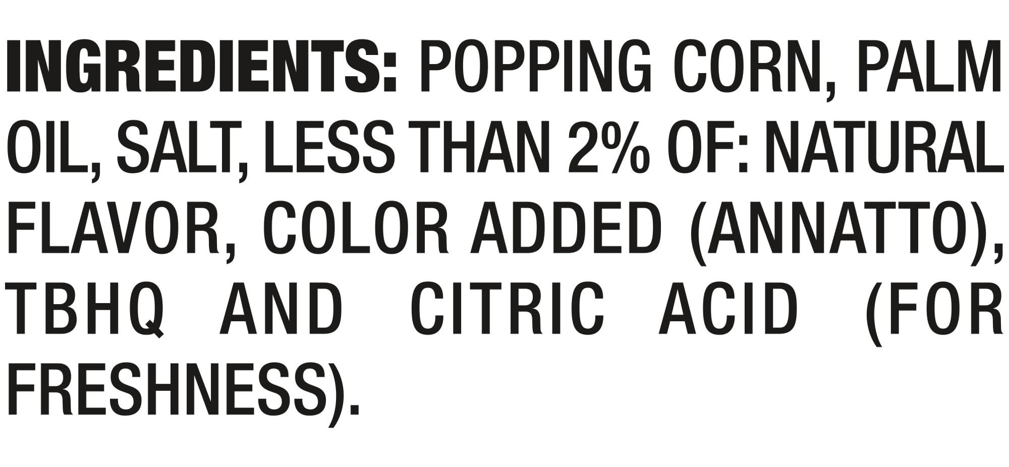 Ingredients: Popping Corn, Palm Oil, Salt, Less than 2% of: Natural Flavor, Color Added Annatto, TBHQ and Citric Acid for Freshness Contains: Corn