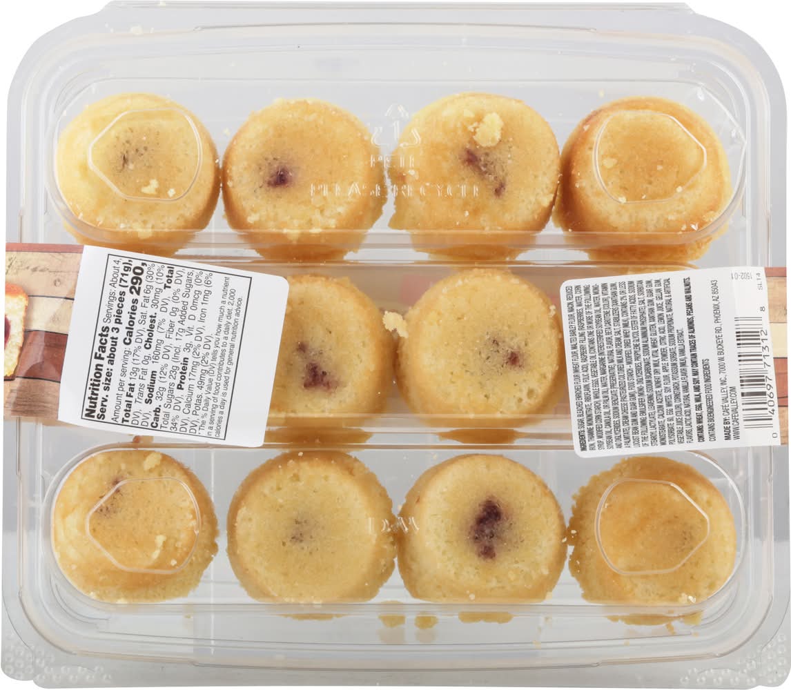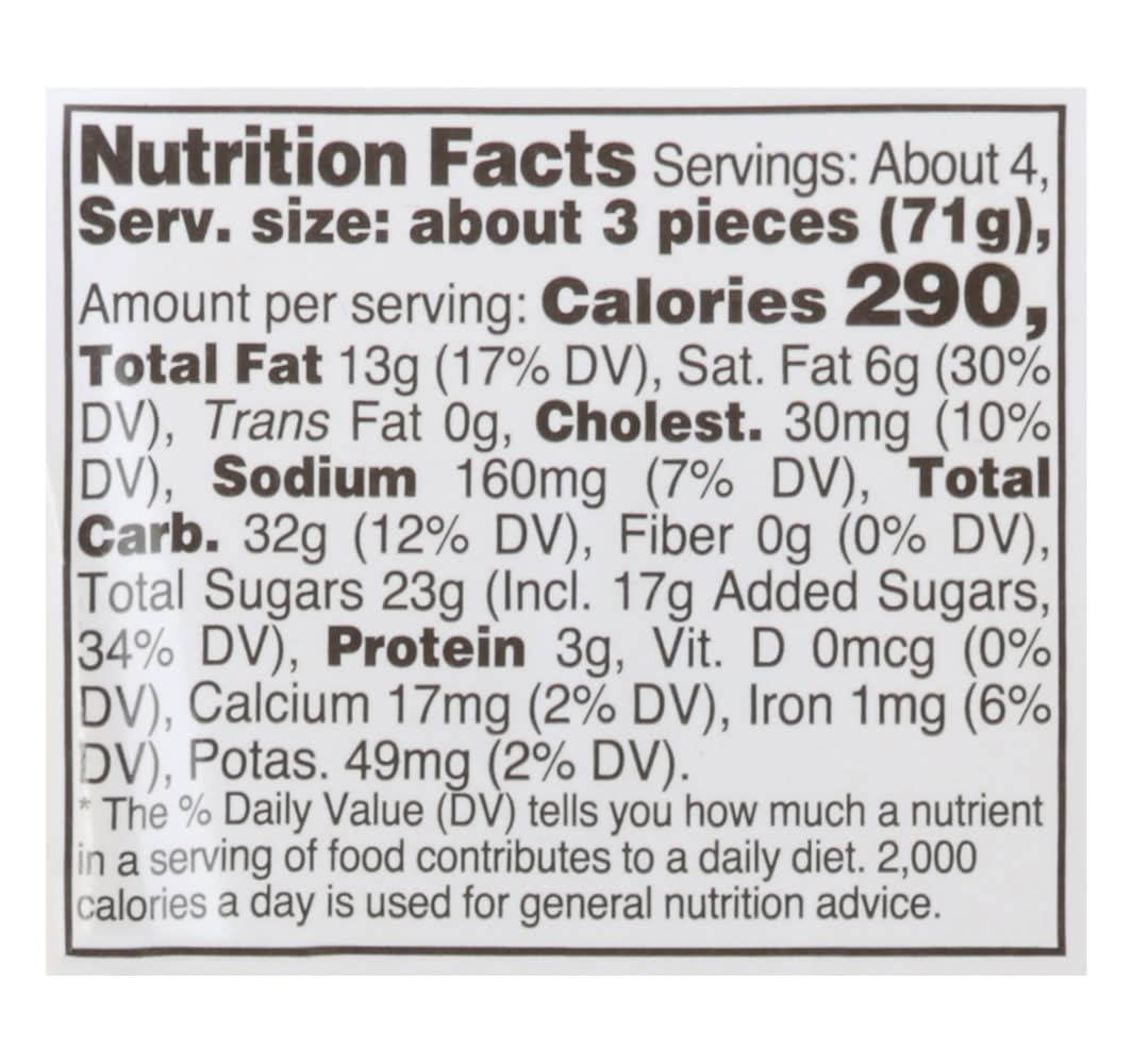 Ingredients: Sugar, Bleached Enriched Flour (Wheat Flour, Malted Barley Flour, Niacin, Reduced Iron, Thiamine Mononitrate, Riboflavin, Folic Acid), Raspberry Filling (Raspberries, Water, Corn Syrup, Modified Corn Starch), Whole Eggs, Vegetable Oil (Contains One or More of the Following: Soybean Oil, Canola Oil, or Palm Oil), Water, Margarine (Interesterified Soybean Oil, Water, Mono- and Diglycerides, Sodium Benzoate [Preservative], Natural Flavor, Beta Carotene [Color], Vitamin A Palmitate), Cream Cheese (Pasteurized Cultured Milk and Cream, Salt, Stabilizers [Xanthan Gum, Locust Bean Gum and Guar Gum]), Food Starch – Modified, Dried Whey (Milk), Contains 2% or Less of the Following: Emulsifier (Mono- Diglycerides, Propylene Glycol Ester of Fatty Acids, Sodium Stearoyl Lactylate), Leavening (Sodium Bicarbonate, Sodium Aluminum Phosphate), Salt, Sorbitan Monostearate, Calcium Acetate, Nonfat Dry Milk, Vital Wheat Gluten, Xanthan Gum, Guar Gum, Vegetable Juice (Color), Cornstarch, Potassium Sorbate, Sodium Propionate, Natural & Artificial Flavors, Lactic Acid, Natural Vanilla Flavor (Milk), Vanilla Extract Contains: Wheat, Eggs, Milk, Soybeans, Gluten, Tree Nuts