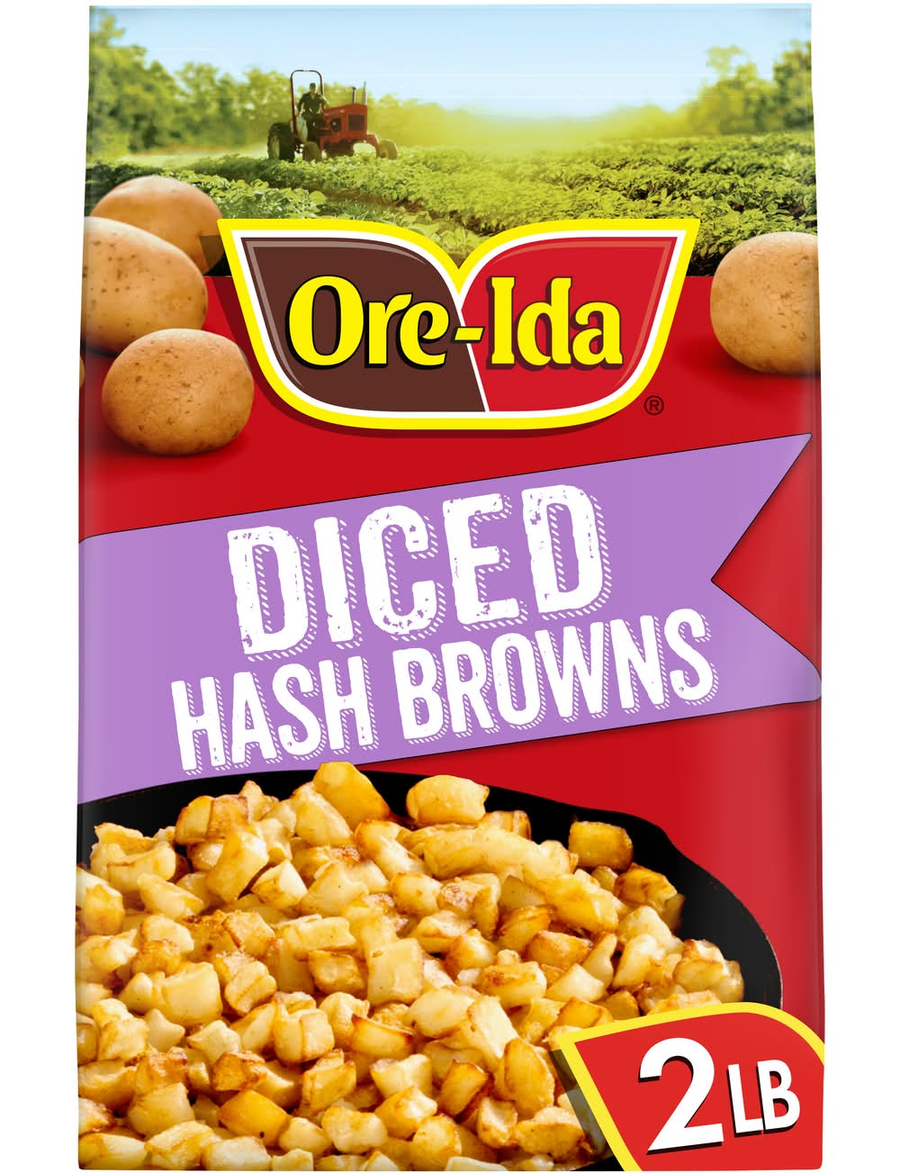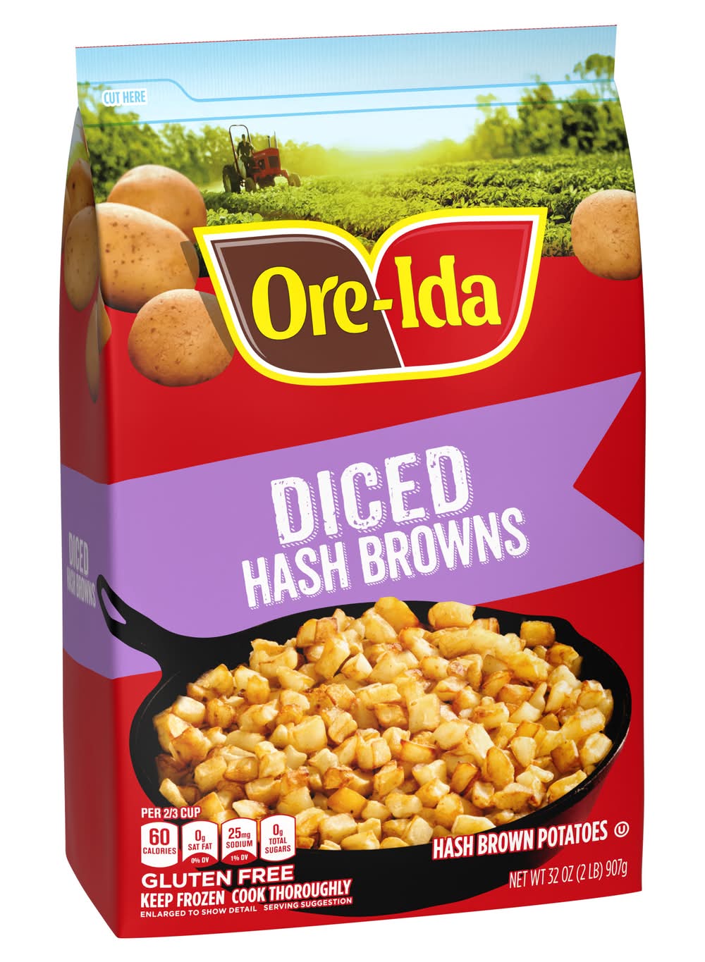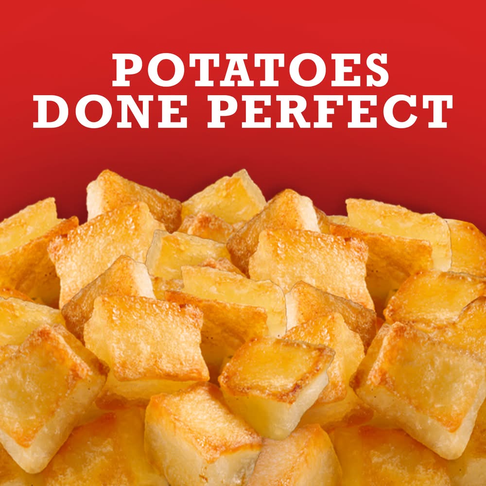 Made with 100% real potatoes. Per Serving: 60 calories; 0 g sat fat (0% DV); 15 mg sodium (1% DV); <1 g total sugars. Gluten free. Oregon & Idaho. Potatoes done perfect. Since 1952. The Ore-Ida brand is committed to providing the highest quality products. Win at mealtime with Ore-Ida. US grown potatoes. Scan for more food information. Call 1-800-892-2401 more food information. We welcome your comments. Please have the package with you when you call. Monday – Friday. Write us: Kraft Heinz Foods, consumer affairs Ore-Ida Diced Hash Brown Potatoes make it easy to enjoy diced hash browns at home. These hash browns are made from freshly peeled, American grown potatoes. These diced hash browns offer a golden, crispy texture to make your next family breakfast a success. Toss these diced potatoes in a skillet with a little oil to cook them according to package instructions for perfectly crispy results. A classic potato option, these frozen hash browns are perfect as a breakfast side dish or in a casserole. These breakfast potatoes come sealed in a 32 ounce bag to help lock in flavor. Your family deserves the highest quality. Kraft Heinz Foods Company, Pittsburgh,PA,15222
