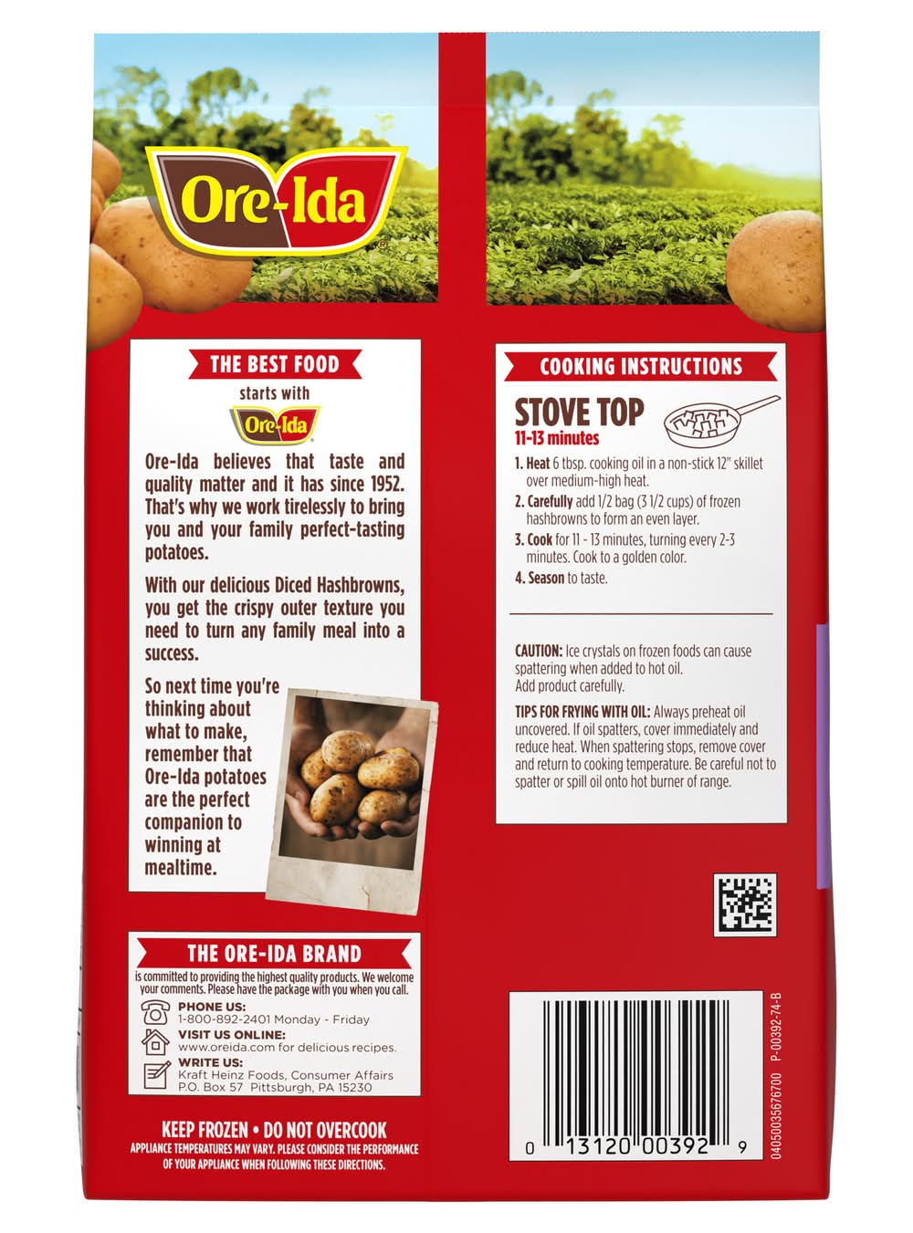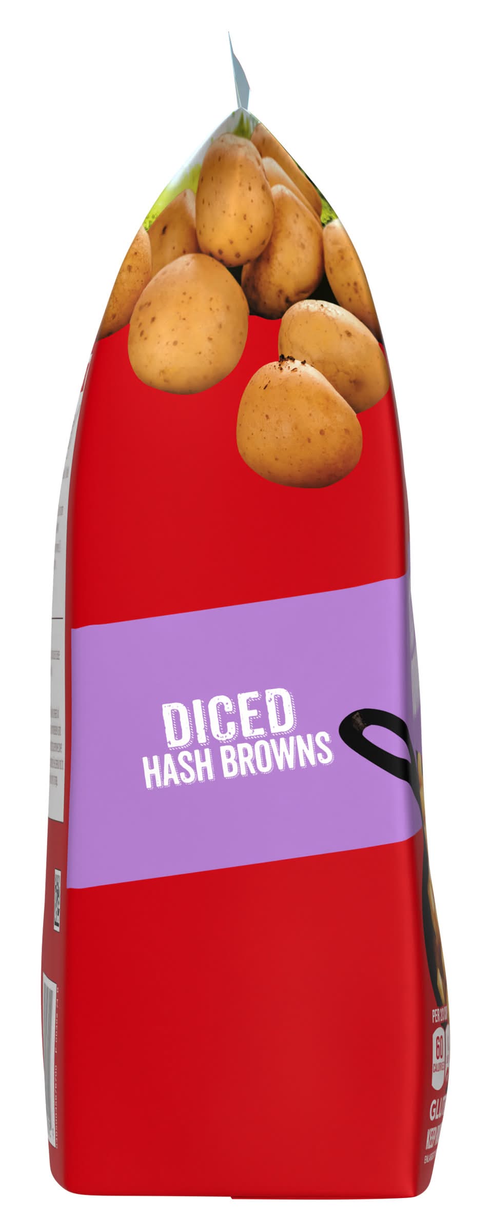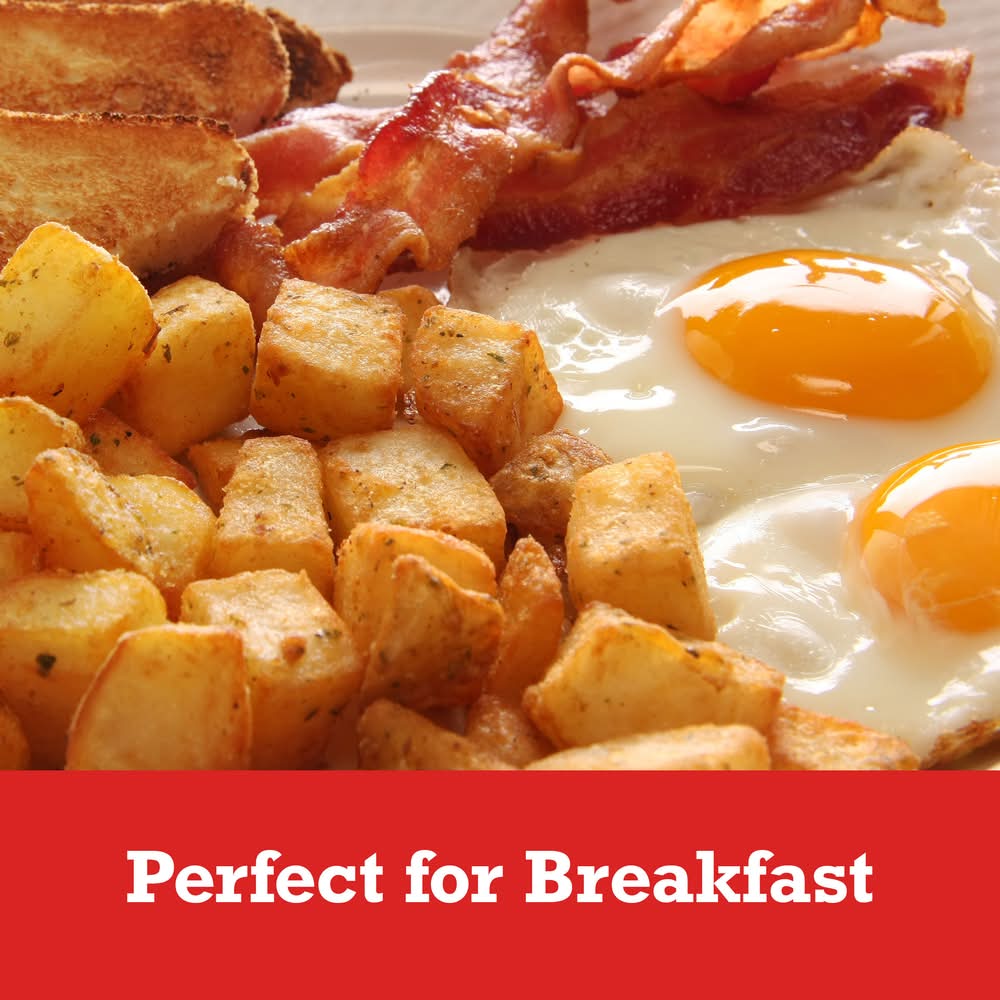 Made with 100% real potatoes. Per Serving: 60 calories; 0 g sat fat (0% DV); 15 mg sodium (1% DV); <1 g total sugars. Gluten free. Oregon & Idaho. Potatoes done perfect. Since 1952. The Ore-Ida brand is committed to providing the highest quality products. Win at mealtime with Ore-Ida. US grown potatoes. Scan for more food information. Call 1-800-892-2401 more food information. We welcome your comments. Please have the package with you when you call. Monday – Friday. Write us: Kraft Heinz Foods, consumer affairs Ore-Ida Diced Hash Brown Potatoes make it easy to enjoy diced hash browns at home. These hash browns are made from freshly peeled, American grown potatoes. These diced hash browns offer a golden, crispy texture to make your next family breakfast a success. Toss these diced potatoes in a skillet with a little oil to cook them according to package instructions for perfectly crispy results. A classic potato option, these frozen hash browns are perfect as a breakfast side dish or in a casserole. These breakfast potatoes come sealed in a 32 ounce bag to help lock in flavor. Your family deserves the highest quality. Kraft Heinz Foods Company, Pittsburgh,PA,15222