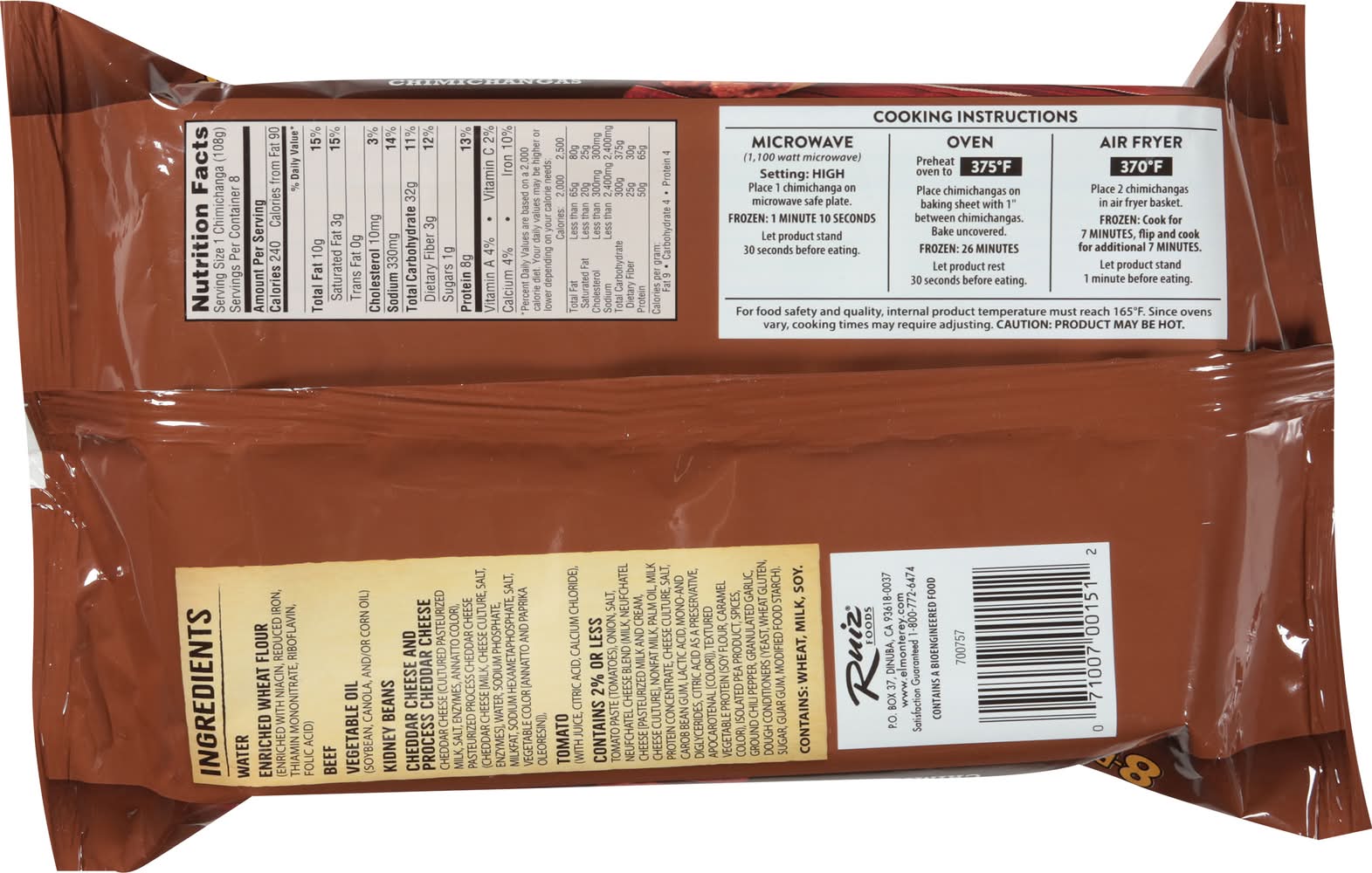 Directions for use: Directions: Cooking Instructions: Microwave (1,100 watt microwave): Setting: High. Place 1 chimichanga on microwave safe plate. Frozen: 1 minute 10 seconds. Let product stand 30 seconds before eating. Oven: Preheat oven to 375 degrees F. Place chimichangas on baking sheet with 1 inch between chimichangas. Bake uncovered. Frozen: 26 minutes. Let product rest 30 seconds before eating. Air Fryer (370 degrees F): Place 2 chimichangas in air fryer basket. Frozen: Cook for 7 minutes, flip and cook for additional 7 minutes. Let product stand 1 minute before eating. For food safety and quality, internal product temperature must reach 165 degrees F. Since ovens vary, cooking times may require adjusting. Caution: Product may be hot. Keep frozen. Storage recommendation: Keep frozen.