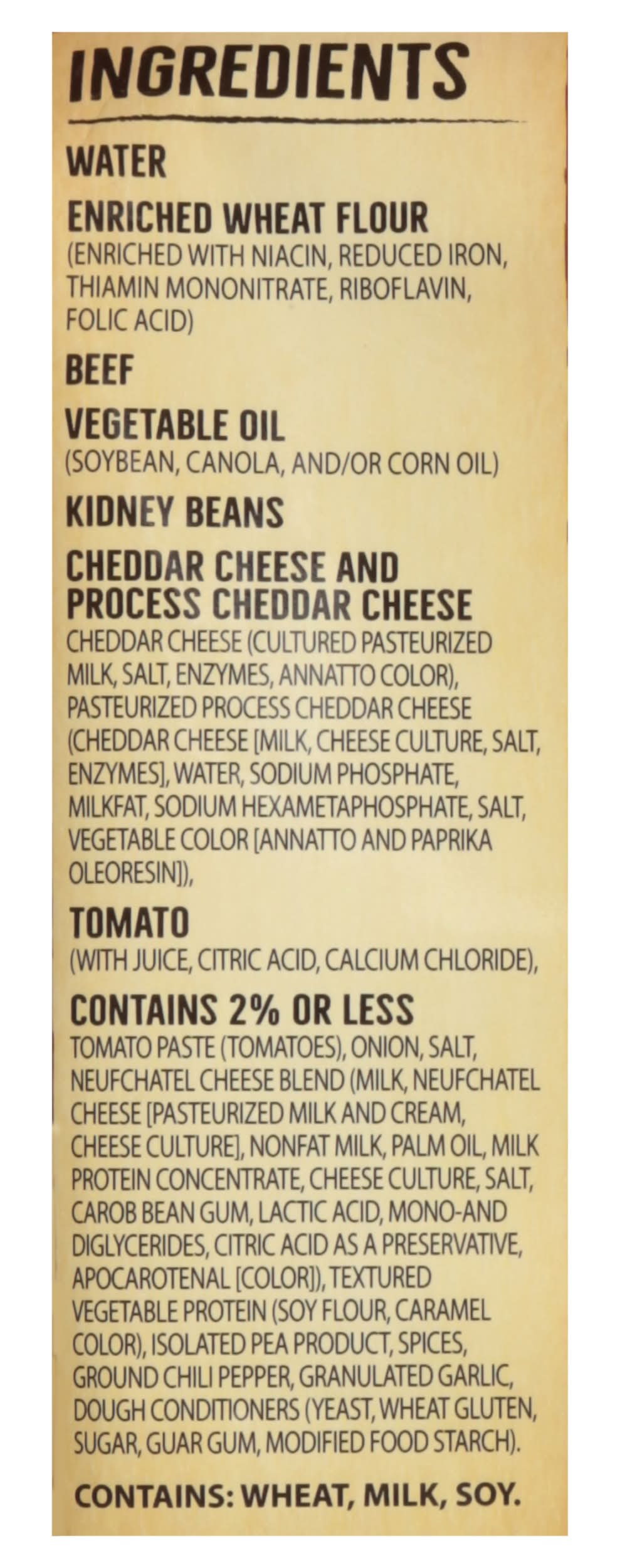 Ingredients: Water, Enriched Wheat Flour (Enriched with Niacin, Reduced Iron, Thiamin Mononitrate, Riboflavin, Folic Acid), Beef, Vegetable Oil (Soybean, Canola, and/or Corn Oil), Kidney Beans, Cheddar Cheese and Process Cheddar Cheese Cheddar Cheese (Cultured Pasteurized Milk, Salt, Enzymes, Annatto Color), Pasteurized Process Cheddar Cheese (Cheddar Cheese [Milk, Cheese Culture, Salt, Enzymes], Water, Sodium Phosphate, Milkfat, Sodium Hexametaphosphate, Salt, Vegetable Color [Annatto and Paprika Oleoresin]), Tomato (with Juice, Citric Acid, Calcium Chloride), Contains 2% or Less Tomato Paste (Tomatoes), Onion, Salt, Neufchatel Cheese Blend (Milk, Neufchatel Cheese [Pasteurized Milk and Cream Cheese Culture], Nonfat Milk, Palm Oil, Milk Protein Concentrate, Cheese Culture, Salt, Carob Bean Gum, Lactic Acid, Mono-and Diglycerides, Citric Acid as a Preservative, Apocarotenal [Color]), Textured Vegetable Protein (Soy Flour, Caramel Color), Isolated Pea Product, Spices, Ground Chili Pepper, Granulated Garlic Dough Conditioners (Yeast, Wheat Gluten, Sugar, Guar Gum, Modified Food Starch) Contains: Wheat, Milk, Soybeans, Gluten
