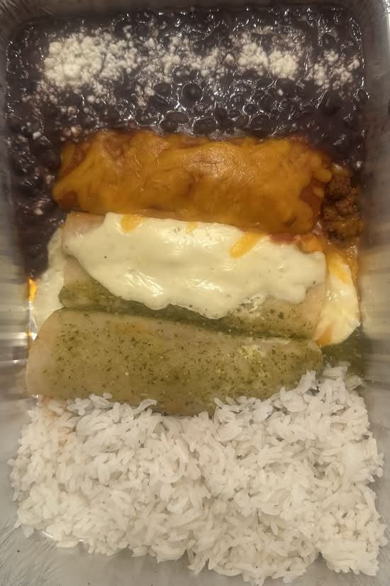 One chicken, one beef and one cheese enchilada topped with green (tomatillo), white (chile con queso), and red (special enchilada) sauce, accompanied with black beans and white rice.