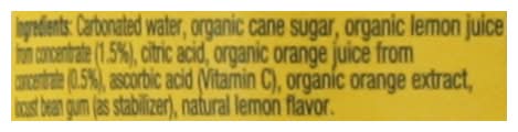 Ingredients: Carbonated Water, Organic Cane Sugar, Organic Lemon Juice from Concentrate (1.5%), Citric Acid, Organic Orange Juice from Concentrate (0.5%), Ascorbic Acid (Vitamin C), Organic Orange Extract, Locust Bean Gum (as Stabilizer), Natural Lemon Flavor