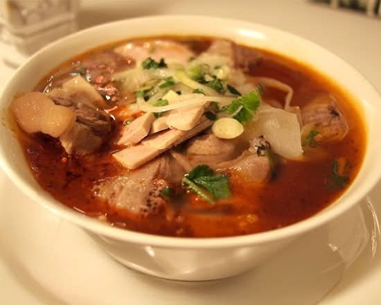 Spicy beef noodle and broth with slice beef, tendon and pork hock.