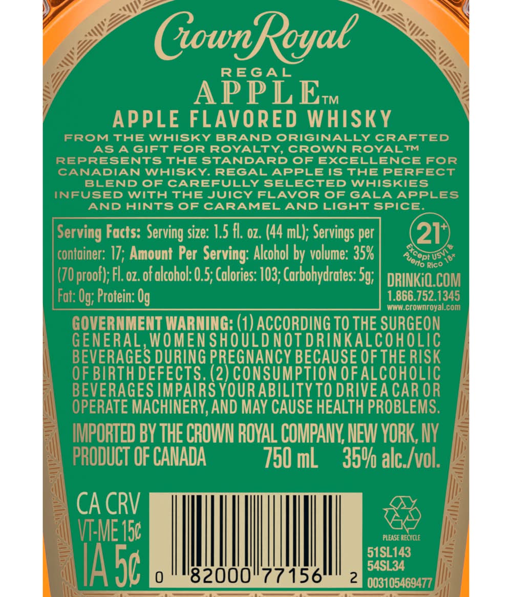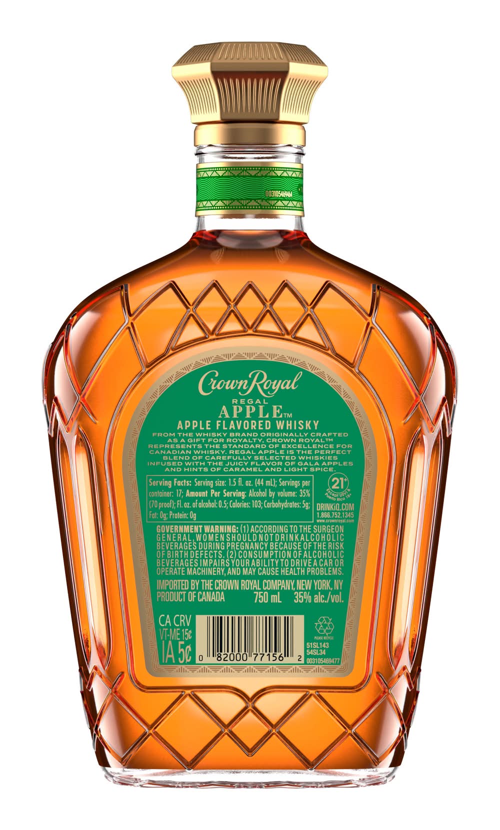 Unwind in luxury with a glass of Crown Royal Regal Apple Flavored Whisky. Infused with regal gala apples and hints of caramel and spice, our 70 proof whisky provides a refined, crisp taste. Made with the signature smoothness of traditional Crown Royal and matured to perfection, our apple flavored whisky will enhance any cocktail party or celebration. • Flavor: Apple • Alcohol by volume: 35% • Packaging: Reusable