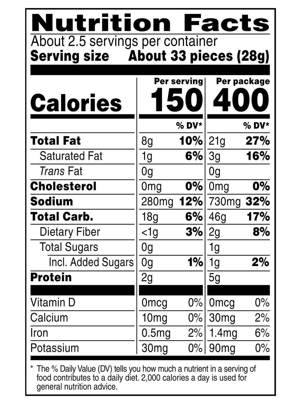 Ingredients: Enriched Corn Meal (Corn Meal, Ferrous Sulfate, Niacin, Thiamin Mononitrate, Riboflavin, Folic Acid), Vegetable Oil (Corn, Canola, and/or Sunflower Oil), Salt, Whey, Maltodextrin (Made from Corn), Buttermilk, Monosodium Glutamate, Romano Cheese (Cow's Milk, Cheese Cultures, Salt, Enzymes), Tomato Powder, Cheddar Cheese (Milk, Cheese Cultures, Salt, Enzymes), Onion Powder, Artificial Color (Red 40 Lake, Yellow 6 Lake, Yellow 6), Natural Flavors, Garlic Powder, Sodium Caseinate, Lactose, Lactic Acid, Citric Acid, Sugar, Skim Milk, Whey Protein Concentrate, Disodium Inosinate, and Disodium Guanylate Contains: Milk, Lactose