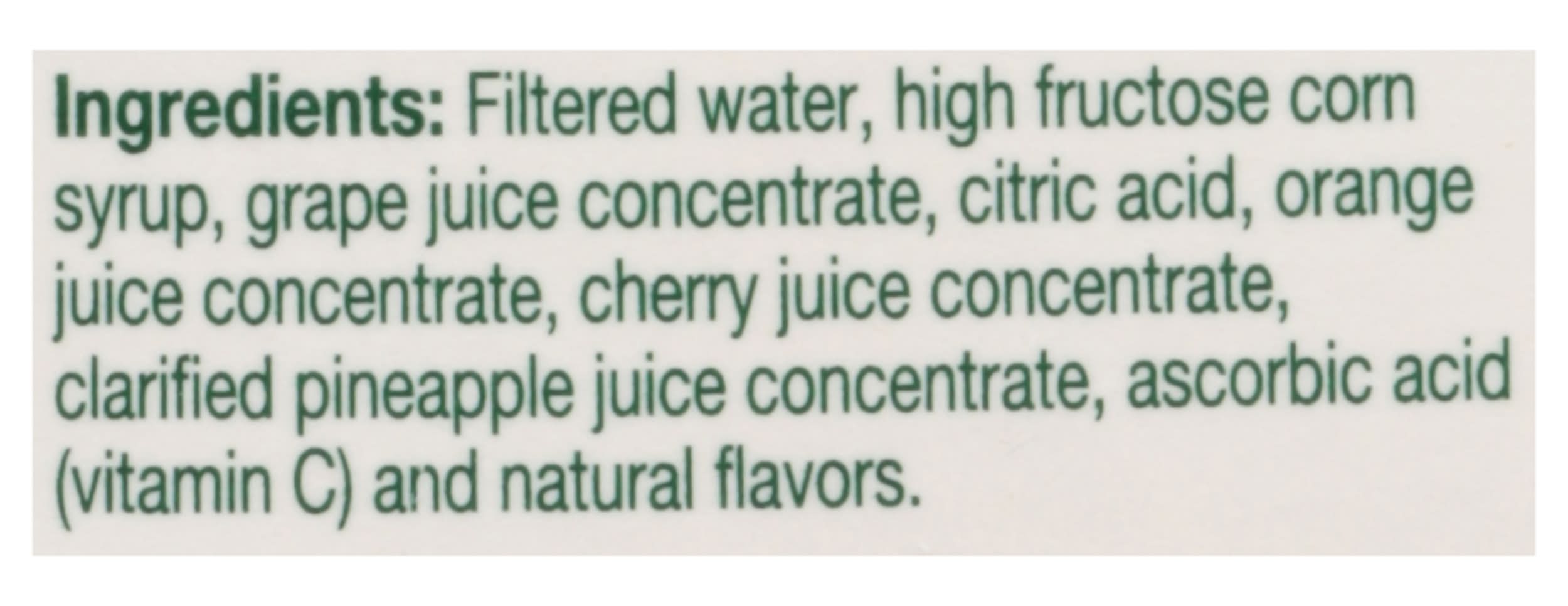 Ingredients: Filtered Water, High Fructose Corn Syrup, Grape Juice Concentrate, Citric Acid, Orange Juice Concentrate, Cherry Juice Concentrate, Clarified Pineapple Juice Concentrate, Ascorbic Acid (Vitamin C) and Natural Flavors