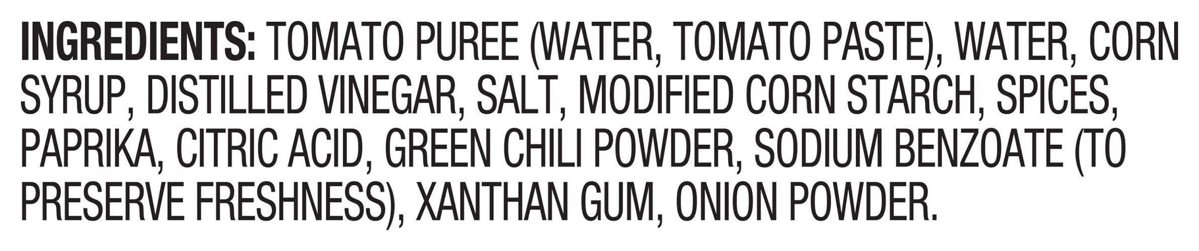 Ingredients: Tomato Puree (Water, Tomato Paste), Water, Corn Syrup, Distilled Vinegar, Salt, Modified Corn Starch, Spices, Paprika, Citric Acid, Green Chili Powder, Sodium Benzoate (to Preserve Freshness), Xanthan Gum, Onion Powder Contains: Corn