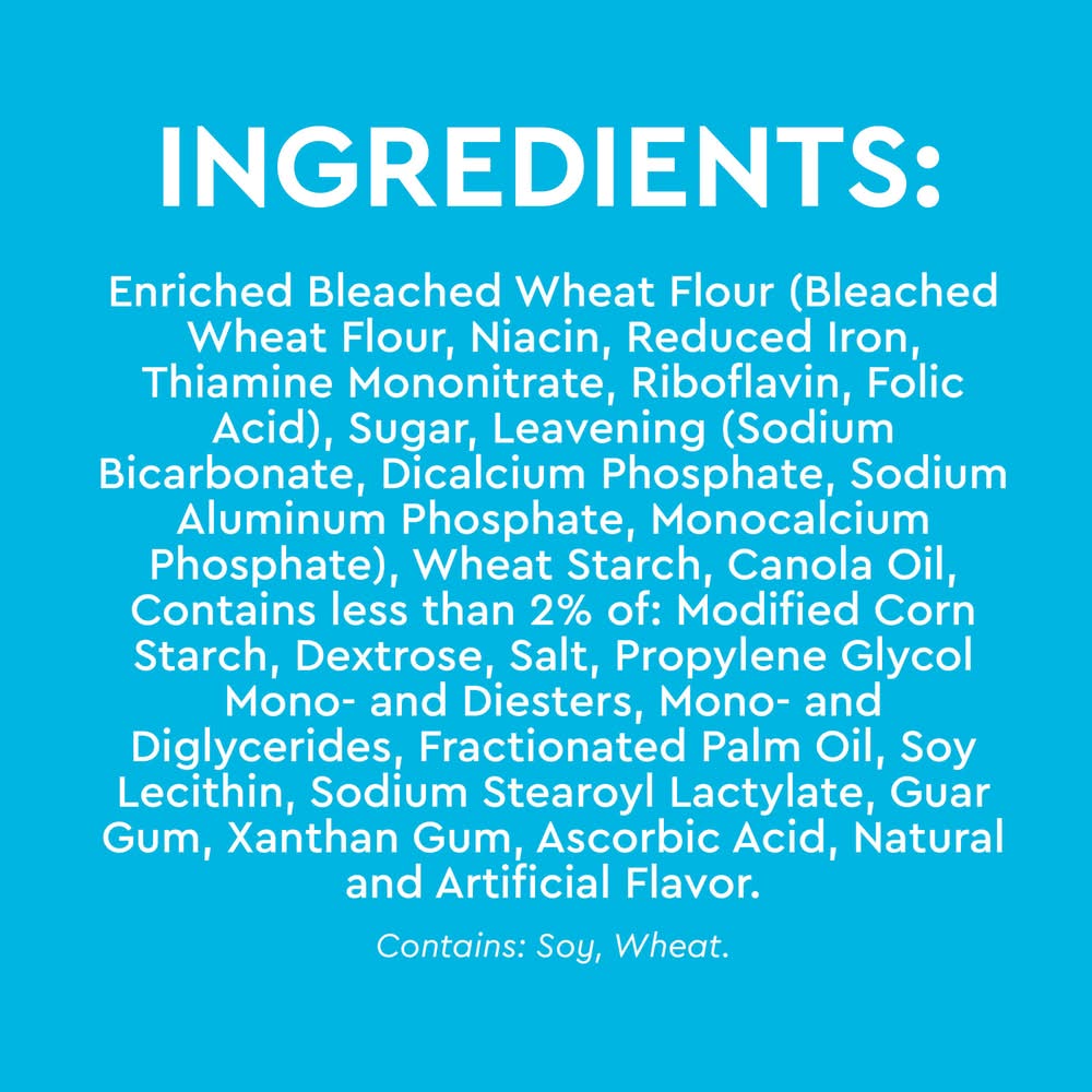 Ingredients: INGREDIENTS: SUGAR, ENRICHED BLEACHED WHEAT FLOUR (FLOUR, NIACIN, REDUCED IRON, THIAMINE MONONITRATE, RIBOFLAVIN, FOLIC ACID), EMULSIFIED PALM SHORTENING (PALM OIL, PROPYLENE GLYCOL MONO- AND DIESTERS OF FATS AND FATTY ACIDS, MONO- AND DIGLYCERIDES, SODIUM STEAROYL LACTYLATE), LEAVENING (SODIUM BICARBONATE, DICALCIUM PHOSPHATE, SODIUM ALUMINUM PHOSPHATE, MONOCALCIUM PHOSPHATE), WHEAT STARCH. CONTAINS 2% OR LESS OF: MODIFIED FOOD STARCH, DEXTROSE, SALT, SOY LECITHIN, NATURAL AND ARTIFICIAL FLAVOR, GUAR GUM, XANTHAN GUM. Contains: Soy, Wheat