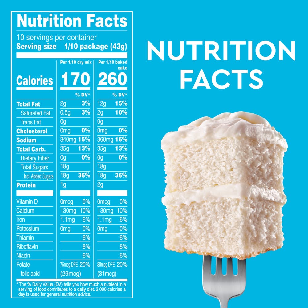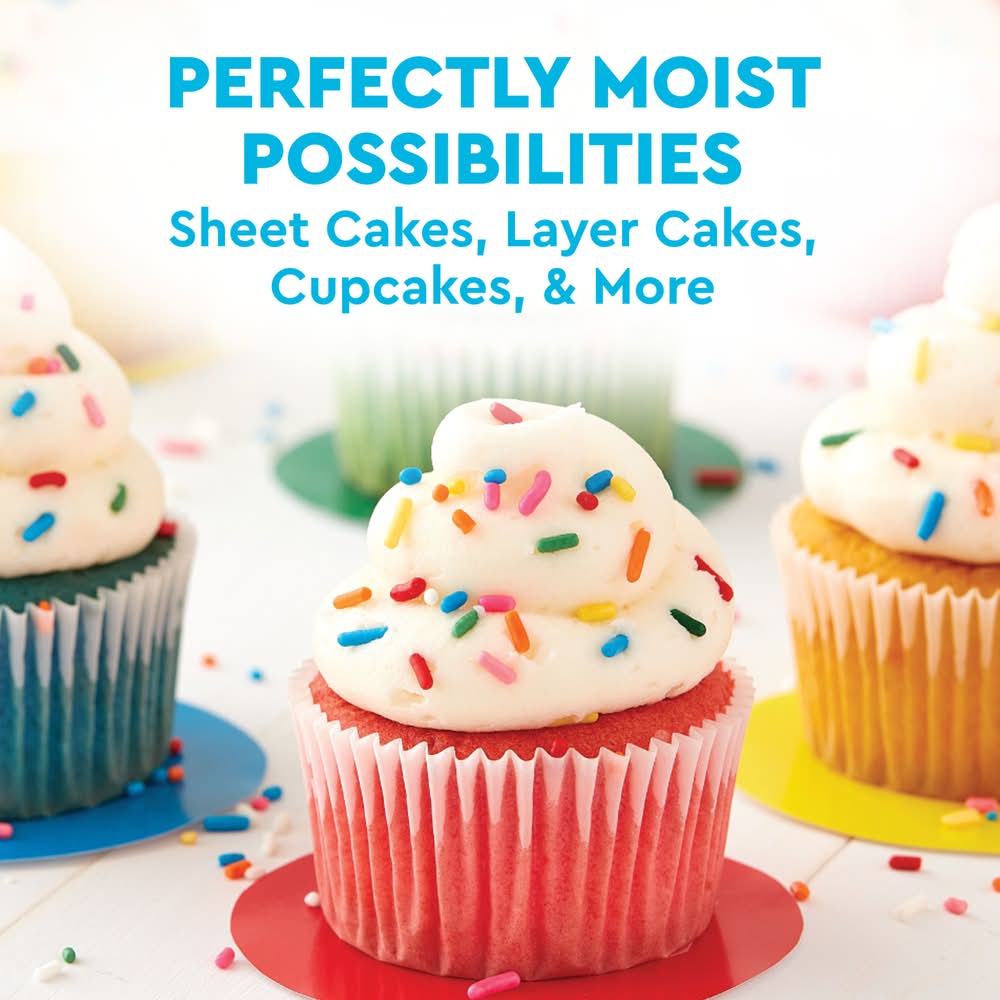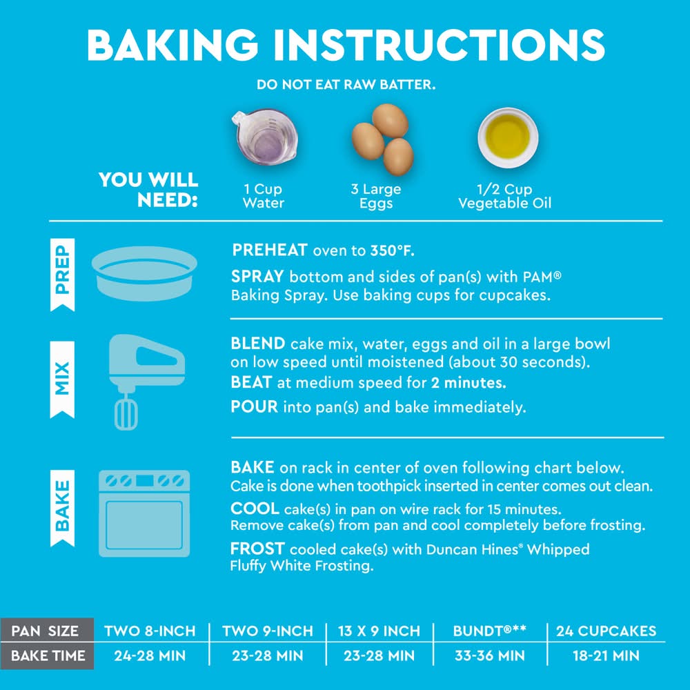 You will need: 1 cup water; 3 large egg whites; 1/3 vegetable oil. do not eat raw batter. baking instructions: see side of box for ingredient swaps. step 1 prep: preheat oven to 350 degrees f. for metal and glass pan(s), 325 degrees f. for dark or coated pan(s) (add 3-5 minutes to bake time for dark or coated pans(s). grease sides and bottom of pan(s) and flour lightly. use baking cups for cupcakes. step 2 mix: blend cake mix, water, oil and egg whites in a large bowl at low speed until moistened (about 30 seconds). beat at medium speed for 2 minutes. pour batter in pan(s) and bake immediately. step 3 bake: bake following chart below, cake is done when toothpick inserted in center comes out clean. cool cake(s) in pan on wire rack for 15 minutes. remove cake(s) from pan and cool completely before frosting. high altitude (over 3,500 ft): preheat oven to 350 degrees f. add 2 tablespoons of flour into cake mix. add 1/3 cup oil, 1 cup water and 3 large egg whites. blend as directed in step 2. bake at 350 degrees f. two 8-inch pans 23-28 min; 13 x 9-inch pan baked 21-25 min; 24 cupcakes 16-20 min. pan size: two 8-inch bake time: 26-31 min; pan size: two 9-inch. baked time: 23-28 min; pan sized: 13 x 9. bake time: 23-28 min; pan size: bundt (bundt is a registered trademark of northland aluminum products, inc, minneapolis, minnesota): bake time: 33-36 min; pan size: 24 cupcakes. bake time 18-21 min. try these ingredients swaps! replace 1 cup of water with: 1 cup of your favorite dairy or plant-based milk. replace 1/3 cup of vegetable oil with: 1/3 cup greek yogurt or refined coconut oil.