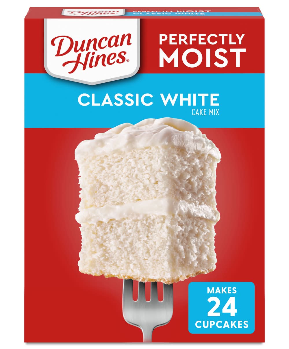 Duncan Hines Perfectly Moist Classic White Cake Mix makes a moist and delicious white cake that is sure to become a family favorite. The smooth and velvety cake batter makes it easy to bake a perfectly moist cake every time. Simply add water, egg whites and vegetable oil to the baking mix and stir to combine. Pour into a pan and bake for the recommended time in the instructions. Prepare this white cake mix to make a decadent layer cake with frosting or add sprinkles for a festive birthday cake. You can also use it as a cupcake mix, or to make fun cake creations like cake pops. This certified Kosher boxed cake mix makes one 8 or 9 inch layer cake, one 13 x 9 inch sheet cake or 24 cupcakes. From birthday cake to single serve desserts, Duncan Hines has you covered when you're ready to bake and create. Bake someone happy! • Brand: Duncan hines • Conagra Brands, PO Box 3534,Chicago,IL,60654