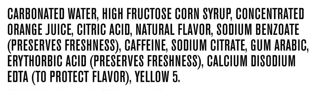Ingredients: Carbonated Water, High Fructose Corn Syrup, Concentrated Orange Juice, Citric Acid, Natural Flavor, Sodium Benzoate (Preserves Freshness), Caffeine, Sodium Citrate, Gum Arabic, Erythorbic Acid (Preserves Freshness), Calcium Disodium EDTA (to Protect Flavor), Yellow 5