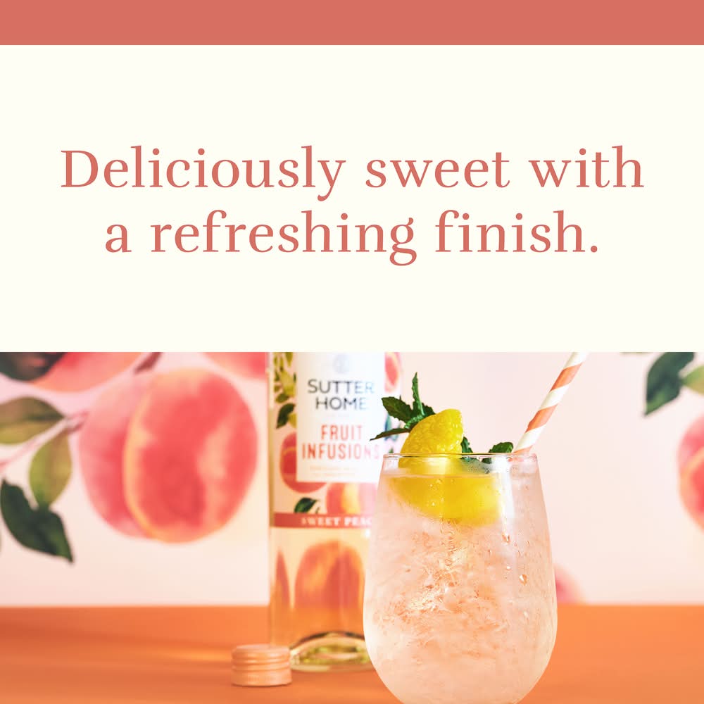 Sutter Home Fruit Infusions Sweet Peach White Wine is bursting with so much ripe, luscious, juicy peach flavor, you won't want to put your glass down. This white wine is deliciously sweet with natural peach juice, a light, refreshing finish and a hint of spritz. Sutter Home Fruit Infusions Sweet Peach wine earned 91 points -Silver from 2022 California State Fair and Gold from 2022 Dan Berger's International Wine Competition and Earned 87 points - Silver from 2021 Beverage Testing Institute. A perfect pairing with peach desserts and spicy dishes, this fruit wine is a delicious choice for sunny afternoons and warm summer evenings. Sutter Home Fruit Infusions Sweet Peach Wine is made using real fruit juice, natural flavors, and grapes sourced from California vineyards. This bottled wine has 7.5% alcohol by volume and features a screw cap for easy opening—no corkscrew required. Sutter Home, family owned since 1948, is the brand generations of wine lovers trust to deliver consistent, award-winning quality and value for every wine occasion. • Brand: Sutter home • Category: Fruit wine • Alcohol by volume: 7.5% • Tasting notes: peach • Food pairing: dessert - fruit