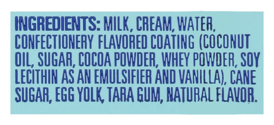 Ingredients: Milk, Cream, Water, Confectionery Flavored Coating (Coconut Oil, Sugar, Cocoa Powder, Whey Powder, Soy Lecithin as an Emulsifier and Vanilla), Cane Sugar, Egg Yolk, Tara Gum, Natural Flavor Contains: Milk, Tree Nuts, Coconuts, Soybeans, Eggs
