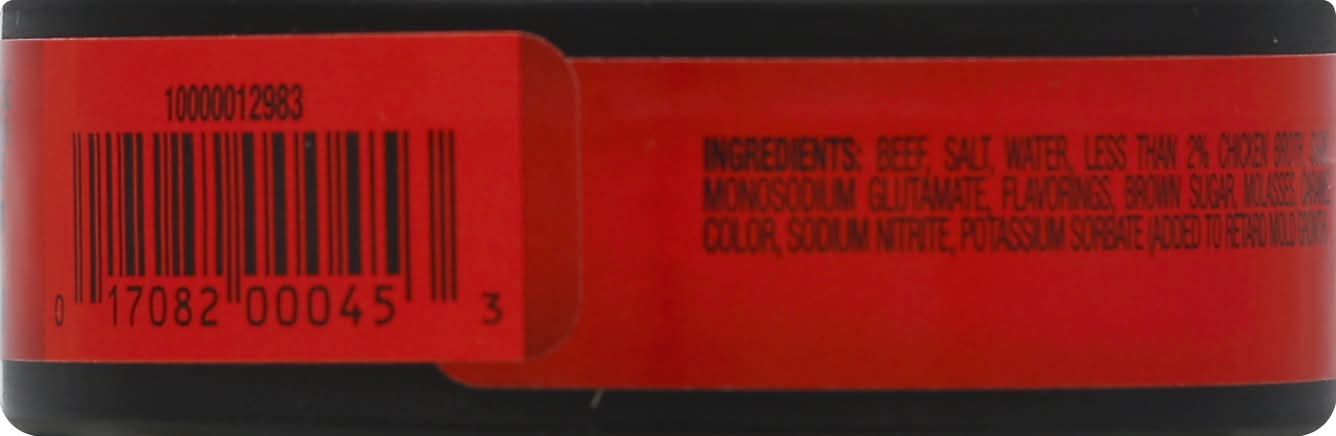 Ingredients: Beef, Salt, Water, Less than 2% Chicken Broth, Sugar, Monosodium Glutamate, Flavorings, Brown Sugar, Molasses, Caramel Color, Sodium Nitrite, Potassium Sorbate (Added to Retard Mold Growth)