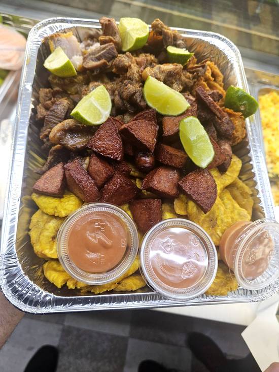 Fried Green Plantains, Fried Pork, Dominican Sausage, Fried Chicken Breasts, and Fried Cheese.